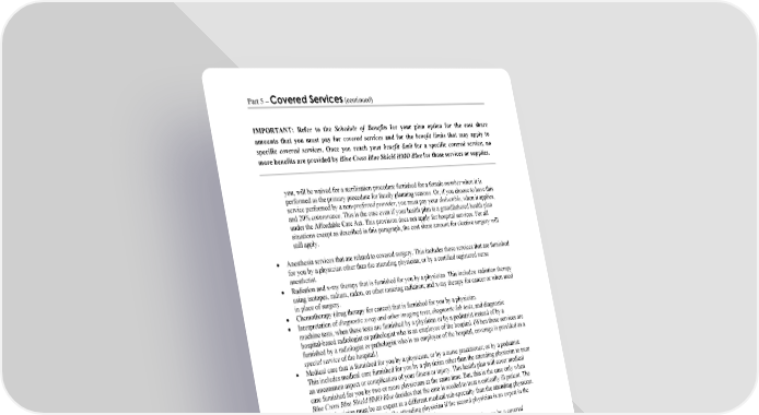 Part 5 – Covered Services (continued) IMPORTANT: Refer to the Schedule of Benefits for your plan option for the cost share amounts that you must pay for covered services and for the benefit limits that may apply to specific covered services. Once you reach your benefit limit for a specific covered service, no more benefits are provided by Blue Cross Blue Shield HMO Blue for those services or supplies. WORDS IN ITALICS ARE EXPLAINED IN PART 2. Page 35 you, will be waived for a sterilization procedure furnished for a female member when it is performed as the primary procedure for family planning reasons. Or, if you choose to have this service performed by a non-preferred provider, you must pay your deductible, when it applies, and 20% coinsurance. This is the case even if your health plan is a grandfathered health plan under the Affordable Care Act. This provision does not apply for hospital services. For all situations except as described in this paragraph, the cost share amount for elective surgery will still apply. Anesthesia services that are related to covered surgery. This includes those services that are furnished for you by a physician other than the attending physician; or by a certified registered nurse anesthetist. Radiation and x-ray therapy that is furnished for you by a physician. This includes: radiation therapy using isotopes, radium, radon, or other ionizing radiation; and x-ray therapy for cancer or when used in place of surgery. Chemotherapy (drug therapy for cancer) that is furnished for you by a physician. Interpretation of diagnostic x-ray and other imaging tests, diagnostic lab tests, and diagnostic machine tests, when these tests are furnished by a physician or by a podiatrist instead of by a hospital-based radiologist or pathologist who is an employee of the hospital. (When these services are furnished by a radiologist or pathologist who is an employee of the hospital, coverage is provided as a special service of the hospital.) Medical care that is furnished for you by a physician; or by a nurse practitioner; or by a podiatrist. This includes medical care furnished for you by a physician other than the attending physician to treat an uncommon aspect or complication of your illness or injury. This health plan will cover medical care furnished for you by two or more physicians at the same time. But, this is the case only when Blue Cross Blue Shield HMO Blue decides that the care is needed to treat a critically ill patient. The second physician must be an expert in a different medical sub-specialty than the attending physician. This health plan will cover only the attending physician if the second physician is an expert in the same medical sub-specialty as the attending physician. Monitoring services that are related to dialysis, when they are furnished for you by a covered provider. Consultations. These services must be furnished for you by a physician other than the attending physician. The consultation must be needed to diagnose or treat the condition for which you were admitted. Or, it must be for a complication that develops after you are an inpatient. The attending physician must order the consultation. The physician who furnishes it must send a written report to Blue Cross Blue Shield HMO Blue if they ask for one. The physician who furnishes this consultation for you must be an expert in a different medical sub-specialty than the attending physician. This health plan will cover only the attending physician if the consultant is an expert in the same medical sub-specialty as the attending physician. Intensive care services. These services must be furnished for you by a physician other than the attending physician; or by a nurse practitioner. This means services that you need for only a limited number of hours to treat an uncommon aspect or complication of your illness or injury.