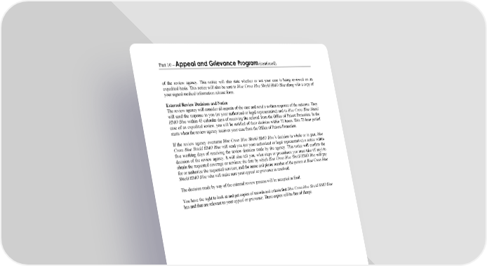 Part 10 – Appeal and Grievance Program (continued) WORDS IN ITALICS ARE EXPLAINED IN PART 2. Page 93 of the review agency. This notice will also state whether or not your case is being reviewed on an expedited basis. This notice will also be sent to Blue Cross Blue Shield HMO Blue along with a copy of your signed medical information release form. External Review Decisions and Notice The review agency will consider all aspects of the case and send a written response of the outcome. They will send the response to you (or your authorized or legal representative) and to Blue Cross Blue Shield HMO Blue within 45 calendar days of receiving the referral from the Office of Patient Protection. In the case of an expedited review, you will be notified of their decision within 72 hours. This 72-hour period starts when the review agency receives your case from the Office of Patient Protection. If the review agency overturns Blue Cross Blue Shield HMO Blue’s decision in whole or in part, Blue Cross Blue Shield HMO Blue will send you (or your authorized or legal representative) a notice within five working days of receiving the review decision made by the agency. This notice will confirm the decision of the review agency. It will also tell you: what steps or procedures you must take (if any) to obtain the requested coverage or services; the date by which Blue Cross Blue Shield HMO Blue will pay for or authorize the requested services; and the name and phone number of the person at Blue Cross Blue Shield HMO Blue who will make sure your appeal or grievance is resolved. The decision made by way of the external review process will be accepted as final. You have the right to look at and get copies of records and criteria that Blue Cross Blue Shield HMO Blue has and that are relevant to your appeal or grievance. These copies will be free of charge.