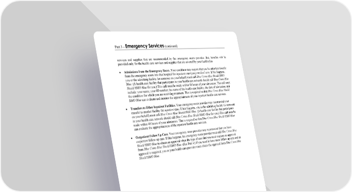 Part 3 – Emergency Services (continued) WORDS IN ITALICS ARE EXPLAINED IN PART 2. Page 26 services and supplies that are recommended by the emergency room provider. But, benefits will be provided only for the health care services and supplies that are covered by your health plan. Admissions from the Emergency Room. Your condition may require that you be admitted directly from the emergency room into that hospital for inpatient emergency medical care. If this happens, you or the admitting facility (or someone on your behalf) must call Blue Cross Blue Shield HMO Blue. (A health care facility that participates in your health care network should call Blue Cross Blue Shield HMO Blue for you.) This call must be made within 48 hours of your admission. This call must include: your name; your ID number; the name of the health care facility; the date of admission; and the condition for which you are receiving treatment. This is required so that Blue Cross Blue Shield HMO Blue can evaluate and monitor the appropriateness of your inpatient health care services. Transfers to Other Inpatient Facilities. Your emergency room provider may recommend your transfer to another facility for inpatient care. If this happens, you or the admitting facility (or someone on your behalf) must call Blue Cross Blue Shield HMO Blue. (A health care facility that participates in your health care network should call Blue Cross Blue Shield HMO Blue for you.) This call must be made within 48 hours of your admission. This is required so that Blue Cross Blue Shield HMO Blue can evaluate the appropriateness of the inpatient health care services. Outpatient Follow Up Care. Your emergency room provider may recommend that you have outpatient follow up care. If this happens, the emergency room provider must call Blue Cross Blue Shield HMO Blue to obtain an approval when the type of care that you need requires an approval from Blue Cross Blue Shield HMO Blue. (See Part 4.) If you need to have more follow up care and an approval is required, you or your health care provider must obtain the approval from Blue Cross Blue Shield HMO Blue.
