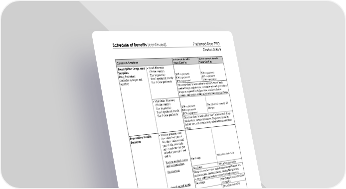 Schedule of Benefits (continued) Preferred Blue PPO Deductible II This chart shows your cost share for covered services. You must pay all charges in excess of a benefit limit. Page 7 hppodedIISoB-0125 Covered Services In-Network Benefits Your Cost Is: Out-of-Network Benefits Your Cost Is: Retail Pharmacy (30-day supply) $15 copayment $30 copayment $50 copayment $30 copayment $60 copayment $100 copayment Tier 1 (generic): Tier 2 (preferred brand): Tier 3 (non-preferred): This cost share is waived for in-network Tier 1 birth control drugs and devices; certain in-network preventive drugs as required by federal law; insulin infusion pumps; and certain orally-administered anticancer drugs. Mail Order Pharmacy (90-day supply) $30 copayment $60 copayment $150 copayment Not covered; you pay all charges Prescription Drugs and Supplies Drug Formulary (includes syringes and needles) Tier 1 (generic): Tier 2 (preferred brand): Tier 3 (non-preferred): This cost share is waived for Tier 1 birth control drugs and devices; certain preventive drugs as required by federal law; and certain orally-administered anticancer drugs. Routine pediatric care (ten visits first year of life, three visits second year of life, two visits age 2, and one visit per calendar year age 3 and older) Routine medical exams and immunizations No charge 20% after deductible No charge 20% after deductible Routine tests These covered services include (but are not limited to): routine exams; immunizations; routine lab tests and x-rays; and blood tests to screen for lead poisoning. Annual mental health wellness exams No charge No charge (deductible does not apply) Preventive Health Services Preventive dental care for members under age 18 for treatment of cleft lip/cleft palate No charge 20% after deductible