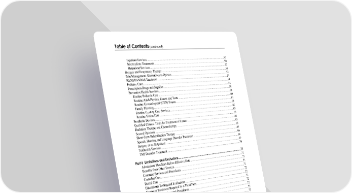 Table of Contents (continued) iii Inpatient Services............................................................................................................................50 Intermediate Treatments .................................................................................................................50 Outpatient Services.........................................................................................................................53 Oxygen and Respiratory Therapy ........................................................................................................53 Pain Management Alternatives to Opiates...........................................................................................53 PANS/PANDAS Treatment.................................................................................................................54 Podiatry Care........................................................................................................................................54 Prescription Drugs and Supplies..........................................................................................................54 Preventive Health Services ..................................................................................................................58 Routine Pediatric Care....................................................................................................................58 Routine Adult Physical Exams and Tests.......................................................................................60 Routine Gynecological (GYN) Exams ...........................................................................................61 Family Planning..............................................................................................................................62 Routine Hearing Care Services.......................................................................................................62 Routine Vision Care........................................................................................................................63 Prosthetic Devices................................................................................................................................63 Qualified Clinical Trials for Treatment of Cancer...............................................................................64 Radiation Therapy and Chemotherapy ................................................................................................65 Second Opinions ..................................................................................................................................65 Short-Term Rehabilitation Therapy.....................................................................................................65 Speech, Hearing, and Language Disorder Treatment ..........................................................................66 Surgery as an Outpatient......................................................................................................................66 Telehealth Services ..............................................................................................................................69 TMJ Disorder Treatment......................................................................................................................70 Part 6 Limitations and Exclusions ...........................................................................................71 Admissions That Start Before Effective Date......................................................................................71 Benefits from Other Sources................................................................................................................71 Cosmetic Services and Procedures ......................................................................................................71 Custodial Care......................................................................................................................................71 Dental Care ..........................................................................................................................................72 Educational Testing and Evaluations...................................................................................................72 Exams or Treatment Required by a Third Party ..................................................................................72 Experimental Services and Procedures................................................................................................72 Eyewear................................................................................................................................................72 Medical Devices, Appliances, Materials, and Supplies.......................................................................72 Missed Appointments ..........................................................................................................................73 Non-Covered Providers........................................................................................................................73 Non-Covered Services .........................................................................................................................73 Personal Comfort Items .......................................................................................................................74 Private Room Charges .........................................................................................................................74 Services and Supplies Furnished After Termination Date...................................................................74 Services Furnished to Immediate Family.............................................................................................75 Part 7 Other Party Liability.............................................................................