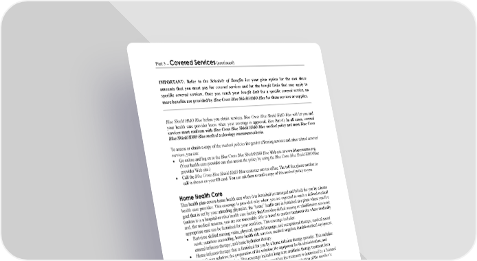 Part 5 – Covered Services (continued) IMPORTANT: Refer to the Schedule of Benefits for your plan option for the cost share amounts that you must pay for covered services and for the benefit limits that may apply to specific covered services. Once you reach your benefit limit for a specific covered service, no more benefits are provided by Blue Cross Blue Shield HMO Blue for those services or supplies. WORDS IN ITALICS ARE EXPLAINED IN PART 2. Page 42 Blue Shield HMO Blue before you obtain services. Blue Cross Blue Shield HMO Blue will let you and your health care provider know when your coverage is approved. (See Part 4.) In all cases, covered services must conform with Blue Cross Blue Shield HMO Blue medical policy and meet Blue Cross Blue Shield HMO Blue medical technology assessment criteria. To access or obtain a copy of the medical policies for gender affirming services and other related covered services, you can: Go online and log on to the Blue Cross Blue Shield HMO Blue Web site at www.bluecrossma.org. (Your health care provider can also access the policy by using the Blue Cross Blue Shield HMO Blue provider Web site.) Call the Blue Cross Blue Shield HMO Blue customer service office. The toll free phone number to call is shown on your ID card. You can ask them to mail a copy of this medical policy to you. Home Health Care This health plan covers home health care when it is furnished (or arranged and billed) for you by a home health care provider. This coverage is provided only when: you are expected to reach a defined medical goal that is set by your attending physician; the “home” health care is furnished at a place where you live (unless it is a hospital or other health care facility that furnishes skilled nursing or rehabilitation services); and, for medical reasons, you are not reasonably able to travel to another treatment site where medically appropriate care can be furnished for your condition. This coverage includes: Part-time skilled nursing visits; physical, speech/language, and occupational therapy; medical social work; nutrition counseling; home health aide services; medical supplies; durable medical equipment; enteral infusion therapy; and basic hydration therapy. Home infusion therapy that is furnished for you by a home infusion therapy provider. This includes: the infusion solution; the preparation of the solution; the equipment for its administration; and necessary part-time nursing. This coverage includes long-term antibiotic therapy treatment for a member who has been diagnosed with Lyme disease when the treatment is determined by a licensed physician to be medically necessary and is ordered after a complete evaluation of the member’s: symptoms; results of diagnostic lab tests; or response to treatment. When physical, speech/language, and/or occupational therapy is furnished as part of your covered home health care program, a benefit limit will not apply to these services. No benefits are provided for: meals, personal comfort items, and housekeeping services; custodial care; services to treat mental conditions as described in this Subscriber Certificate for “Mental Health and Substance Use Treatment”; and home infusion therapy, including the infusion solution, when it is furnished by a pharmacy or other health care provider that is not a home infusion therapy provider. (The only exception is for enteral infusion therapy and basic hydration therapy that is furnished by a home health care provider.)