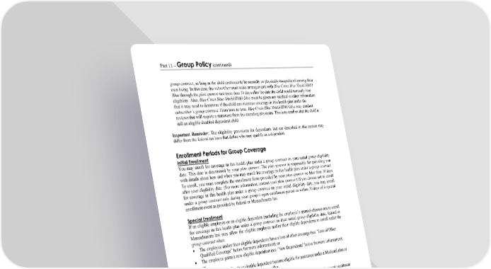 Part 11 – Group Policy (continued) WORDS IN ITALICS ARE EXPLAINED IN PART 2. Page 96 group contract, so long as the child continues to be mentally or physically incapable of earning their own living. In this case, the subscriber must make arrangements with Blue Cross Blue Shield HMO Blue through the plan sponsor not more than 30 days after the date the child would normally lose eligibility. Also, Blue Cross Blue Shield HMO Blue must be given any medical or other information that it may need to determine if the child can maintain coverage in this health plan under the subscriber’s group contract. From time to time, Blue Cross Blue Shield HMO Blue may conduct reviews that will require a statement from the attending physician. This is to confirm that the child is still an eligible disabled dependent child. Important Reminder: The eligibility provisions for dependents that are described in this section may differ from the federal tax laws that define who may qualify as a dependent. Enrollment Periods for Group Coverage Initial Enrollment You may enroll for coverage in this health plan under a group contract on your initial group eligibility date. This date is determined by your plan sponsor. The plan sponsor is responsible for providing you with details about how and when you may enroll for coverage in this health plan under a group contract. To enroll, you must complete the enrollment form provided by your plan sponsor no later than 30 days after your eligibility date. (For more information, contact your plan sponsor.) If you choose not to enroll for coverage in this health plan under a group contract on your initial eligibility date, you may enroll under a group contract only during your group’s open enrollment period or within 30 days of a special enrollment event as provided by federal or Massachusetts law. Special Enrollment If an eligible employee or an eligible dependent (including the employee’s spouse) chooses not to enroll for coverage in this health plan under a group contract on their initial group eligibility date, federal or Massachusetts law may allow the eligible employee and/or their eligible dependents to enroll under the group contract when: The employee and/or their eligible dependents have a loss of other coverage (see “Loss of Other Qualified Coverage” below for more information); or The employee gains a new eligible dependent (see “New Dependents” below for more information); or The employee and/or their eligible dependent become eligible for assistance under a Medicaid plan or a state Children’s Health Insurance Program plan. These rights are known as your “special enrollment rights.” There may be additional special enrollment rights as a result of changes required by federal law. For example, these changes may include special enrollment rights for: individuals who are newly eligible for coverage as a result of changes to dependent eligibility; and/or individuals who are newly eligible for coverage as a result of the elimination of a lifetime maximum.