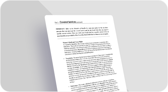 Part 5 – Covered Services (continued) IMPORTANT: Refer to the Schedule of Benefits for your plan option for the cost share amounts that you must pay for covered services and for the benefit limits that may apply to specific covered services. Once you reach your benefit limit for a specific covered service, no more benefits are provided by Blue Cross Blue Shield HMO Blue for those services or supplies. WORDS IN ITALICS ARE EXPLAINED IN PART 2. Page 34 Women’s Health and Cancer Rights As required by federal law, this coverage includes breast reconstruction in connection with a mastectomy. This health plan provides coverage for: all stages of reconstruction of the breast on which the mastectomy was performed; surgery and reconstruction of the other breast to produce a symmetrical appearance; and prostheses and treatment of physical complications at all stages of mastectomy, including lymphedemas. These services will be furnished in a manner determined in consultation with the attending physician and the patient. Transplants. This means human organ (or tissue) and stem cell (“bone marrow”) transplants that are furnished according to Blue Cross Blue Shield HMO Blue medical policy and medical technology assessment criteria. It also includes one or more stem cell transplants for a member who has been diagnosed with breast cancer that has spread and the member meets the standards that have been set by the Massachusetts Department of Public Health. For covered transplants, coverage also includes: the harvesting of the donor’s organ (or tissue) or stem cells when the recipient is a member; and drug therapy that is furnished during the transplant procedure to prevent the transplanted organ (or tissue) or stem cells from being rejected. “Harvesting” includes: the surgical removal of the donor’s organ (or tissue) or stem cells; and the related medically necessary services and/or tests that are required to perform the transplant itself. No benefits are provided for the harvesting of the donor’s organ (or tissue) or stem cells when the recipient is not a member. (See “Lab Tests, X-Rays, and Other Tests” for your coverage for donor testing.) Oral surgery. This means: reduction of a dislocation or fracture of the jaw or facial bone; excision of a benign or malignant tumor of the jaw; and orthognathic surgery that you need to correct a significant functional impairment that cannot be adequately corrected with orthodontic services. You must have a serious medical condition that requires that you be admitted to a hospital as an inpatient in order for the surgery to be safely performed. (Orthognathic surgery is not covered when it is performed mainly for cosmetic reasons. This surgery must be performed along with orthodontic services. If it is not, the oral surgeon must send a letter to Blue Cross Blue Shield HMO Blue asking for approval for the surgery. No benefits are provided for the orthodontic services, except as described in this Subscriber Certificate on page 38 for the treatment of conditions of cleft lip and cleft palate.) This health plan may also cover the removal of impacted teeth when the teeth are fully or partially imbedded in the bone. The Schedule of Benefits for your plan option will tell you whether or not you have coverage for these services. (Also refer to riders—if there are any—that apply to your coverage in this health plan.) Voluntary termination of pregnancy (abortion). Voluntary sterilization procedures. To provide coverage for the women’s preventive health services as recommended by the U.S. Department of Health and Human Services and, as required by state law, any in-network deductible, copayment, and/or coinsurance, whichever applies to