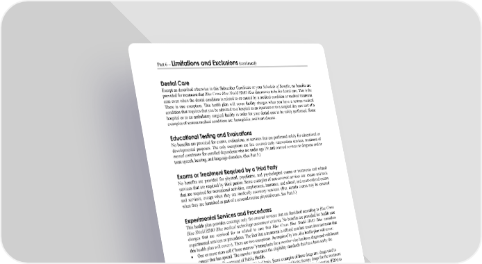 Part 6 – Limitations and Exclusions (continued) WORDS IN ITALICS ARE EXPLAINED IN PART 2. Page 72 Dental Care Except as described otherwise in this Subscriber Certificate or your Schedule of Benefits, no benefits are provided for treatment that Blue Cross Blue Shield HMO Blue determines to be for dental care. This is the case even when the dental condition is related to or caused by a medical condition or medical treatment. There is one exception. This health plan will cover facility charges when you have a serious medical condition that requires that you be admitted to a hospital as an inpatient or to a surgical day care unit of a hospital or to an ambulatory surgical facility in order for your dental care to be safely performed. Some examples of serious medical conditions are: hemophilia; and heart disease. Educational Testing and Evaluations No benefits are provided for exams, evaluations, or services that are performed solely for educational or developmental purposes. The only exceptions are for: covered early intervention services; treatment of mental conditions for enrolled dependents who are under age 19; and covered services to diagnose and/or treat speech, hearing, and language disorders. (See Part 5.) Exams or Treatment Required by a Third Party No benefits are provided for physical, psychiatric, and psychological exams or treatments and related services that are required by third parties. Some examples of non-covered services are: exams and tests that are required for recreational activities, employment, insurance, and school; and court-ordered exams and services, except when they are medically necessary services. (But, certain exams may be covered when they are furnished as part of a covered routine physical exam. See Part 5.) Experimental Services and Procedures This health plan provides coverage only for covered services that are furnished according to Blue Cross Blue Shield HMO Blue medical technology assessment criteria. No benefits are provided for health care charges that are received for or related to care that Blue Cross Blue Shield HMO Blue considers experimental services or procedures. The fact that a treatment is offered as a last resort does not mean that this health plan will cover it. There are two exceptions. As required by law, this health plan will cover: One or more stem cell (“bone marrow”) transplants for a member who has been diagnosed with breast cancer that has spread. The member must meet the eligibility standards that have been set by the Massachusetts Department of Public Health. Certain drugs that are used on an off-label basis. Some examples of these drugs are: drugs used to treat cancer; drugs used to treat HIV/AIDS; and, long-term antibiotic therapy drugs for the treatment of Lyme disease, if the drug has been approved by the U.S. Food and Drug Administration (FDA) to treat other infectious diseases. (See “Home Health Care” for your coverage for long-term antibiotic therapy treatment of Lyme disease.) Eyewear No benefits are provided for eyeglasses and contact lenses, except as described as a covered service in Part 5 or in your Schedule of Benefits and/or riders. Medical Devices, Appliances, Materials, and Supplies No benefits are provided for medical devices, appliances, materials, and supplies, except as described otherwise in Part 5. Some examples of non-covered items are: Devices such as: air conditioners; air purifiers; arch supports; bath seats; bed pans; bath tub grip bars; chair lifts; computerized communication devices (except for those that are described in Part 5);