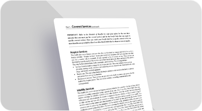 Part 5 – Covered Services (continued) IMPORTANT: Refer to the Schedule of Benefits for your plan option for the cost share amounts that you must pay for covered services and for the benefit limits that may apply to specific covered services. Once you reach your benefit limit for a specific covered service, no more benefits are provided by Blue Cross Blue Shield HMO Blue for those services or supplies. WORDS IN ITALICS ARE EXPLAINED IN PART 2. Page 43 Hospice Services This health plan covers hospice services when they are furnished (or arranged and billed) for you by a hospice provider. “Hospice services” means pain control and symptom relief and supportive and other care for a member who is terminally ill and expected to live 12 months or less. These services are furnished to meet the needs of the member and of their family during the illness and death of the member. They may be furnished at home, in the community, and in facilities. This coverage includes: Services furnished and/or arranged by the hospice provider. These may include services such as: physician, nursing, social, volunteer, and counseling services; inpatient care; home health aide visits; drugs; and durable medical equipment. Respite care. This care is furnished to the hospice patient in order to relieve the family or primary care person from care giving functions. Bereavement services. These services are provided to the family or primary care person after the death of the hospice patient. They can include contacts, counseling, communication, and correspondence. Infertility Services This health plan covers services to diagnose and treat infertility for a member who has not been able to conceive or produce conception during a period of one year. Blue Cross Blue Shield HMO Blue may approve coverage for infertility services in two other situations: when the member has been diagnosed with cancer and, after treatment, the member is expected to become infertile; or when a member is age 35 or older and has not been able to conceive or produce conception during a period of six months. If a member conceives but cannot carry that pregnancy to live birth, the time period that the member tried to conceive prior to achieving that pregnancy will be included in the calculation of the one-year or six- month time period as described above. To receive coverage for infertility services, they must be medically necessary for you, furnished by a covered provider, and approved by Blue Cross Blue Shield HMO Blue as outlined in this Subscriber Certificate and in the Blue Cross Blue Shield HMO Blue medical policy. You and your health care provider must receive approval from Blue Cross Blue Shield HMO Blue before you obtain infertility services. Blue Cross Blue Shield HMO Blue will let you and your health care provider know when your coverage is approved. (See Part 4.) In all cases, covered services must conform with Blue Cross Blue Shield HMO Blue medical policy and meet Blue Cross Blue Shield HMO Blue medical technology assessment criteria. (See page 18 for help for how to access or obtain a copy of the medical policy.) This coverage may include (but is not limited to): Artificial insemination. Sperm and egg and/or inseminated egg procurement and processing. Banking of sperm or inseminated eggs (only when they are not covered by the donor’s health plan); and other services as outlined in Blue Cross Blue Shield HMO Blue medical policy. Infertility technologies, such as: in vitro fertilization and embryo placement; gamete intrafallopian transfer; zygote intrafallopian transfer; natural oocyte retrieval intravaginal fertilization; and intracytoplasmic sperm injection.