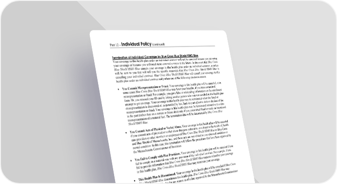 Part 12 – Individual Policy (continued) WORDS IN ITALICS ARE EXPLAINED IN PART 2. Page 109 Termination of Individual Coverage by Blue Cross Blue Shield HMO Blue Your coverage in this health plan under an individual contract will not be canceled because you are using your coverage or because you will need more covered services in the future. In the event that Blue Cross Blue Shield HMO Blue cancels your coverage in this health plan under an individual contract, a notice will be sent to you that will tell you the specific reason(s) that Blue Cross Blue Shield HMO Blue is canceling your individual contract. Blue Cross Blue Shield HMO Blue will cancel your coverage in this health plan under an individual contract only when one of the following situations occurs. You Commit Misrepresentation or Fraud. Your coverage in this health plan will be canceled, or in some cases Blue Cross Blue Shield HMO Blue may limit your benefits, if you have committed misrepresentation or fraud. For example, you gave false or misleading information on the enrollment form. Or, you misused your ID card by letting another person who was not enrolled in this health plan attempt to get coverage. Your coverage in this health plan may be terminated when the fraud or misrepresentation is discovered or, as permitted by law, back to your effective date or the date of the misrepresentation or fraud. Your coverage in this health plan may be terminated retroactive to a date in the past (rather than on a current or future date) only if you committed fraud or made an intentional misrepresentation of a material fact. The termination date will be determined by Blue Cross Blue Shield HMO Blue. You Commit Acts of Physical or Verbal Abuse. Your coverage in this health plan will be canceled if you commit acts of physical or verbal abuse that pose a threat to, or a threat to the health of, health care providers or other members or employees of Blue Cross Blue Shield HMO Blue or Blue Cross and Blue Shield of Massachusetts, Inc., and these acts are not related to your physical condition or mental condition. In this case, this termination will follow the procedures that have been approved by the Massachusetts Commissioner of Insurance. You Fail to Comply with Plan Provisions. Your coverage in this health plan will be canceled if you fail to comply in a material way with any provision of the individual contract. For example, if you fail to provide information that Blue Cross Blue Shield HMO Blue requests related to your coverage in this health plan, Blue Cross Blue Shield HMO Blue may terminate your coverage. This Health Plan Is Discontinued. Your coverage in this health plan will be canceled if Blue Cross Blue Shield HMO Blue discontinues this health plan. Blue Cross Blue Shield HMO Blue may discontinue this health plan for any reason as of a date approved by the Massachusetts Commissioner of Insurance. Medicare Program When you are eligible for Medicare and Medicare is allowed by federal law to be the primary payor, the coverage provided by this health plan will be reduced by the amount of benefits allowed under Medicare for the same covered services. This reduction will be made whether or not you actually receive the benefits from Medicare.