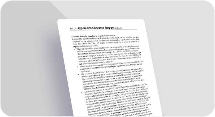 Part 10 – Appeal and Grievance Program (continued) WORDS IN ITALICS ARE EXPLAINED IN PART 2. Page 91 Expedited Review for Immediate or Urgently-Needed Services In place of the internal formal review as described above in this section, you have the right to request an “expedited” review right away when your situation is for immediate or urgently-needed services. Blue Cross Blue Shield HMO Blue will respond to formal requests for a review for immediate or urgently-needed services as follows: When your request for a review concerns medical care or treatment for which waiting for a response under the review time frames described above would seriously jeopardize your life or health or your ability to regain maximum function as determined by Blue Cross Blue Shield HMO Blue or your physician, or if your physician says that you will have severe pain that cannot be adequately managed without the care or treatment that is the subject of the review, Blue Cross Blue Shield HMO Blue will review your request and notify you of the decision within 72 hours after your request is received, or such shorter time period as required by federal law. When a formal review is requested while you are an inpatient, Blue Cross Blue Shield HMO Blue will complete the review and make a decision regarding the request before you are discharged from that inpatient stay. Blue Cross Blue Shield HMO Blue’s decision to deny payment for health care services, including durable medical equipment, may be reversed within 48 hours if your attending physician certifies to Blue Cross Blue Shield HMO Blue that a denial for those health care services would create a substantial risk of serious harm to you if you were to wait for the outcome of the normal formal review process. Your physician can also request the reversal of a denial for durable medical equipment earlier than 48 hours by providing more specific information to Blue Cross Blue Shield HMO Blue about the immediate and severe harm to you. A formal review requested by a member with a terminal illness will be completed by Blue Cross Blue Shield HMO Blue within five working days of receiving the request. In this case, if the expedited review results in a denial for health care services or treatment, Blue Cross Blue Shield HMO Blue will send a letter to the member within five working days. This letter will include: information related to the details of the request for a review; the reasons that Blue Cross Blue Shield HMO Blue has denied the request and the applicable terms of your coverage in this health plan; the specific medical and scientific reasons for which Blue Cross Blue Shield HMO Blue has denied the request; any alternative treatment or health care services and supplies that would be covered; Blue Cross Blue Shield HMO Blue clinical guidelines that apply and were used and any review criteria; and how to request a hearing. When the member requests a hearing, the hearing will be held within ten days. (Or, it will be held within five working days if the attending physician determines after consultation with Blue Cross Blue Shield HMO Blue’s Medical Director and based on standard medical practice that the effectiveness of the health care service, supply, or treatment would be materially reduced if it were not furnished at the earliest possible date.) You and/or your authorized or legal representative(s) may attend this hearing. External Review You must first go through the Blue Cross Blue Shield HMO Blue internal formal appeal and grievance review process as described above, unless Blue Cross Blue Shield HMO Blue has failed to comply with the time frames for the internal formal review or if you (or your authorized or legal representative) are requesting an expedited external review at the same time you (or your authorized or legal representative) are requesting an expedited internal review. The Blue Cross Blue Shield HMO Blue internal formal review decision may be to continue to deny all or part of your coverage in this health plan. When you are denied coverage for a service or supply because Blue Cross Blue Shield HMO Blue has determined that the service or supply is not medically necessary, you have the right to an external review. You are not required to pursue an external review. Your decision whether to pursue an external review will not affect your other coverage. If you receive a denial letter from Blue Cross Blue Shield HMO Blue in response to your internal formal review, the letter will tell you what steps you can take to file a request for an external