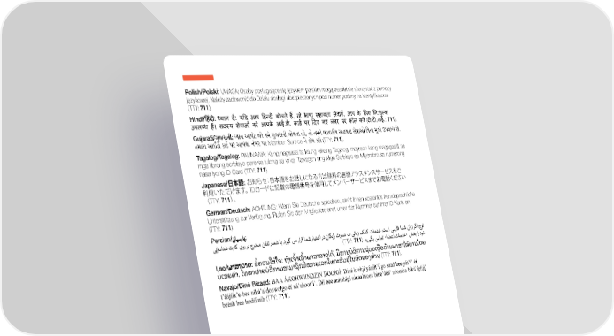 Polish/Polski: UWAGA: Osoby posługujące się językiem polskim mogą bezpłatnie skorzystać z pomocy językowej. Należy zadzwonić do Działu obsługi ubezpieczonych pod numer podany na identyfikatorze (TTY: 711). Hindi/हिंदी: ध्यान द: ्दद आप दिनददी बोलत े ि, तो भयाषया सिया्तया सेवयाएँ, आप के ललए नन:शलक ें ैं ु उपलब्ध ि। सदस् सेवयाओं को आपके आई.डी. कयाड ्ड पर ददए गए नंबर पर कॉल कर (टदी.टदी.वयाई.: 711). ैं ें Gujarati/ગુજરાતી: ધ્યાન આપો: જો તમે ગુજરયાતી બોલતયા હો, તો તમને ભયાષયાકી્ સહયા્તયા સેવયાઓ વવનયા મૂલ્ે ઉપલબ્ધ છે. તમયારયા આઈડી કયાડ્ડ પર આપેલયા નંબર પર Member Service ને કૉલ કરો (TTY: 711). Tagalog/Tagalog: PAUNAWA: Kung nagsasalita ka ng wikang Tagalog, mayroon kang magagamit na mga libreng serbisyo para sa tulong sa wika. Tawagan ang Mga Serbisyo sa Miyembro sa numerong nasa iyong ID Card (TTY: 711). Japanese/日本語: お知らせ:日本語をお話しになる方は無料の言語アシスタンスサービスをご 利用いただけます。IDカードに記載の電話番号を使用してメンバーサービスまでお電話ください (TTY: 711)。 German/Deutsch: ACHTUNG: Wenn Sie Deutsche sprechen, steht Ihnen kostenlos fremdsprachliche Unterstützung zur Verfügung. Rufen Sie den Mitgliederdienst unter der Nummer auf Ihrer ID-Karte an (TTY: 711). نایسراپ: Persian/ ییاسانش تراک یور رب جردنم نفلت رامش اب .دریگ یم رارق امش رایتخا رد ناگیار تروص ب ینابز کمک تامدخ ،تسا یسراف امش نابز رگا :جوت .(TTY: 711) دیریگب سامت »اضعا تامدخ« شخب اب دوخ ້ ້ ້ ພາສາລາວ: ຂຄວນໃສໃຈ: ຖາເຈາເວາພາສາລາວໄດ, ມການບລການຊວຍເຫ Lao/ ອດານພາສາໃຫທານໂດຍ ຼ ໍ ່ ້ ້ ໍ ່ ້ ້ ່ ີ ິ ື ົ ົ ່ ່ ບ ເສຍຄາ. ໂທ ຫາ ຝາຍບລການສະ ມາ ຊກທໝາຍເລກໂທລະສບຢໃນບດຂອງທານ (TTY: 711). ູ ໍ ່ ່ ໍ ່ ່ ິ ິ ີ ັ ັ Navajo/Diné Bizaad: BAA !KOHWIINDZIN DOO&G&: Din4 k’ehj7 y1n7[t’i’go saad bee y1t’i’ 47 t’11j77k’e bee n7k1’a’doowo[go 47 n1’ahoot’i’. D77 bee an7tah7g7 ninaaltsoos bine’d44’ n0omba bik1’7g7ij8’ b44sh bee hod77lnih (TTY: 711). Blue Cross Blue Shield of Massachusetts is an Independent Licensee of the Blue Cross and Blue Shield Association. ® Registered Marks of the Blue Cross and Blue Shield Association. © 2016 Blue Cross and Blue Shield of Massachusetts, Inc., and Blue Cross and Blue Shield of Massachusetts HMO Blue, Inc. Blue Cross Blue Shield of Massachusetts is an Independent Licensee of the Blue Cross and Blue Shield Association. ® Registered Marks of the Blue Cross and Blue Shield Association. 164711MB 55-1493 (8/16) © 2024 Blue Cross and Blue Shield of Massachusetts, Inc., or Blue Cross and Blue Shield of Massachusetts HMO Blue, Inc. 001651831 55-1493 (6/23)