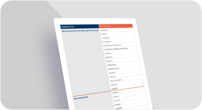 Medication class Medication name Beta-blockers and combination agents (continued) LABETALOL LEVATOL LOPRESSOR METOPROLOL METOPROLOL SUCCINATE ER METOPROLOL/HYDROCHLOROTHIAZIDE NADOLOL NEBIVOLOL PINDOLOL PROPRANOLOL PROPRANOLOL ER TENORETIC TENORMIN TIMOLOL MALEATE TOPROL-XL TRANDATE Bowel preparations CLENPIQ GAVILYTE GOLYTELY MOVIPREP OSMOPREP PEG 3350/ELECTROLYTES PLENVU SODIUM SULFATE/POTASSIUM SULFATE/MAGNESIUM SULFATE SUFLAVE SUPREP SUTAB Calcium channel blockers and combination agents AMLODIPINE CARDIZEM CARDIZEM CD 15
