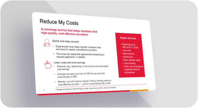 Reduce My Costs A concierge service that helps members find high-quality, cost-effective providers Eligible Services Quick and easy access • Radiology (e.g., • Experienced nurse helps member compare costs MRI and CT scan) and shop for nearby cost-effective providers. • Lab work • The nurse can assist with appointment scheduling or • Mammogram required paperwork, if needed. • Ultrasound • Bone density study Lower costs and more savings • Colonoscopy • Rewards vary, depending on the service and associated • Other non-emergency cost savings outpatient tests & • Average savings more than $1,000 for services like procedures colonoscopy or MRI • Member can still receive reward if they’re already seeing a cost-effective provider — just for using Reduce My Costs 39 * Ranges are based on Harvard Pilgrim’s data; actual service prices vary by and location.