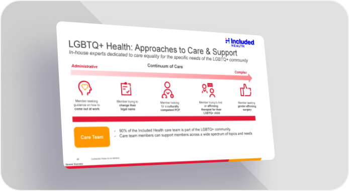 LGBTQ+ Health: Approaches to Care & Support In-house experts dedicated to care equality for the specific needs of the LGBTQ+ community Administrative Continuum of Care Complex Member seeking Member trying to Member looking Member trying to find Member seeking guidance on how to change their for a culturally an affirming gender-affirming come out at work legal name competent PCP therapist for their surgery LGBTQ+ child 90% of the Included Health care team is part of the LGBTQ+ community. Care Team Care team members can support members across a wide spectrum of topics and needs 44 Confidential. Please do not distribute. General Business