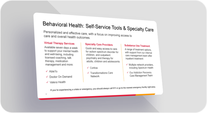 Behavioral Health: Self-Service Tools & Specialty Care Personalized and effective care, with a focus on improving access to care and overall health outcomes. Virtual Therapy Services Specialty Care Providers Substance Use Treatment Available seven days a week Quick and easy access to care A range of treatment options, to support your mental health for autism spectrum disorder for with support from our internal and well-being, including children, and outpatient care management team after licensed coaching, talk psychiatry and therapy for inpatient treatment: therapy, medication adults, children and adolescents: management and more: Multiple network providers, Cortica including Spectrum Health AbleTo Transformations Care Our Addiction Recovery Doctor On Demand Network Care Management Team Valera Health If you’re experiencing a crisis or emergency, you should always call 911 or go to the nearest emergency facility right away. 17