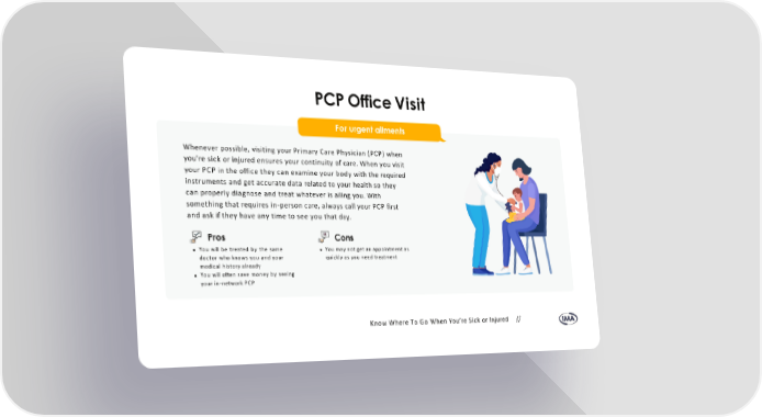 Whenever possible, visiting your Primary Care Physician (PCP) when you’re sick or injured ensures your continuity of care. When you visit your PCP in the office they can examine your body with the required instruments and get accurate data related to your health so they can properly diagnose and treat whatever is ailing you. With something that requires in-person care, always call your PCP first and ask if they have any time to see you that day. PCP Office Visit For urgent ailments Pros You will be treated by the same doctor who knows you and your medical history already You will often save money by seeing your in-network PCP Cons You may not get an appointment as quickly as you need treatment Know Where To Go When You’re Sick or Injured //