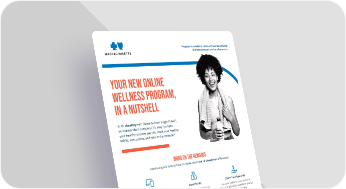 Program is available to Blue Cross Blue Shield of Massachusetts subscribers only. Your new online wellness program, in a nutshell With ahealthyme®´ Rewards from Virgin Pulse®´, an independent company, it’s easy to make your healthy choices pay off. Track your healthy habits, earn points, and rake in the rewards.* Bring on the rewards Here’s a quick look at how to make the most of ahealthyme Rewards: Create an Account Earn Points Claim Your Rewards Sign up at ahealthymerewards.com, Track your healthy habits, join Use your points to shop exclusive and download the Virgin Pulse app. challenges, and complete daily deals, get gift cards, donate to charity, tasks to start earning. or add to your savings. Get Started Ready to start earning? Sign up at ahealthymerewards.com, then download the Virgin Pulse app. Earn up to $400 in rewards annually. *Rewards may be considered a taxable form of income, so you should consult your tax advisor. Blue Cross Blue Shield of Massachusetts is an Independent Licensee of the Blue Cross and Blue Shield Association.