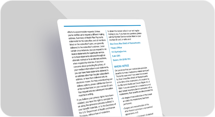 Blue Cross Blue Shield of Massachusetts is an Independent Licensee of the Blue Cross and Blue Shield Association. efforts to accommodate requests. Unless youve notified us to request a different mailing address, Summary of Health Plan Payments statements for the subscriber, and all members listed on the subscribers plan, are generally delivered to the subscribers address. Under certain circumstances, you can request to not receive statements for a particular service, or to have statements delivered through an alternate method or to an alternate address, when required by state law. If you have concerns about protecting the privacy of your medical information in your statements, you can have these statements delivered to an address other than the plan subscribers address, or have them delivered only via electronic means. For help understanding your delivery options, please call Member Service at the number listed on your member ID card. Your request and any subsequent revocation must be in writing. If you believe your privacy rights have been violated, you have the right to complain to us using the grievance process outlined in your benefit materials, or to the Secretary of the U.S. Department of Health and Human Services, without fear of retaliation. About This Notice The original effective date of this notice was April 14, 2003. The effective date of the most recent revision is indicated in the footer of this notice. We are required by law to provide you with this notice of our legal duties and privacy practices and to abide by the notice for as long as it is in effect. We reserve the right to change this notice. Any changes will apply to all information that we maintain, regardless of when it was created or received. If we make a material change to this notice, we will post the revised notice on our website and notify you of the change and how to obtain the revised notice in our next regular mailing to you. If you have any questions, please call the Member Service number listed on your member ID card, or write us at: Blue Cross Blue Shield of Massachusetts Privacy Officer 101 Huntington Ave. Suite 1300 Boston, MA 02199-7611 WHCRA NOTICE Did you know that your medical plan provides benefits for many mastectomy-related services? This is the case even if you were not covered by Blue Cross Blue Shield of Massachusetts at the time of the mastectomy. Its required by the Womens Health and Cancer Rights Act of 1998. If you are covered for a mastectomy and elect breast reconstruction in connection with a mastectomy, then benefits are also provided for: All stages of reconstruction of the breast on which the mastectomy has been performed; Surgery and reconstruction of the other breast to produce a symmetrical appearance; and Prostheses and treatment of physical complications at all stages of the mastectomy, including lymphedemas. Coverage will be provided as determined in consultation with you and your attending doctor. The costs that you pay for these services are the same as those you pay for other services in the same category. To learn more, please call the Member Service number on your member ID card.