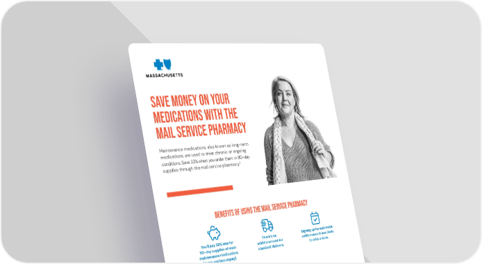 SAVE MONEY ON YOUR MEDICATIONS WITH THE MAIL SERVICE PHARMACY Maintenance medications, also known as long-term medications, are used to treat chronic or ongoing conditions. Save 33% when you order them in 90-day 1 supplies through the mail service pharmacy. BENEFITS OF USING THE MAIL SERVICE PHARMACY You’ll pay 33% less for There’s no Signing up for automatic 90-day supplies of most additional cost for refills makes it less likely maintenance medications standard delivery. to miss a dose. (that’s one less copay). 2 EXAMPLE OF HOW YOU’LL SAVE TYPE OF PRESCRIPTION MEDICATION COPAY Tier 1 Tier 2 Tier 3 $15 $30 $50 30-day supply, retail pharmacy 90-day supply, mail service pharmacy $30 $60 $150 1. In most cases for eligible maintenance medications. Check plan materials for more details. 2. For illustrative purposes only, using a 3-tier plan. (continued) Blue Cross Blue Shield of Massachusetts is an Independent Licensee of the Blue Cross and Blue Shield Association.