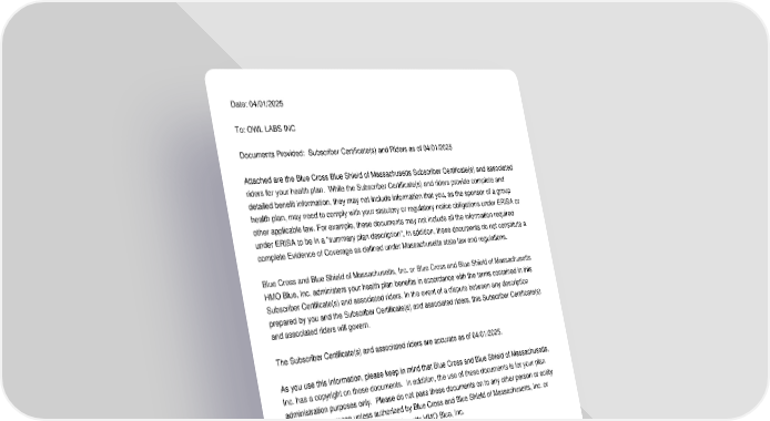 Date:�04/01/2025 To:�OWL LABS INC Documents Provided: Subscriber Certificate(s) and Riders as of 04/01/2025 Attached are the Blue Cross Blue Shield of Massachusetts Subscriber Certificate(s) and associated riders for your health plan. While the Subscriber Certificate(s) and riders provide complete and detailed benefit information, they may not include information that you, as the sponsor of a group health plan, may need to comply with your statutory or regulatory notice obligations under ERISA or other applicable law. For example, these documents may not include all the information required under ERISA to be in a "summary plan description". In addition, these documents do not constitute a complete Evidence of Coverage as defined under Massachusetts state law and regulations. Blue Cross and Blue Shield of Massachusetts, Inc. or Blue Cross and Blue Shield of Massachusetts HMO Blue, Inc. administers your health plan benefits in accordance with the terms contained in this Subscriber Certificate(s) and associated riders. In the event of a dispute between any description prepared by you and the Subscriber Certificate(s) and associated riders, this Subscriber Certificate(s) and associated riders will govern. The Subscriber Certificate(s) and associated riders are accurate as of 04/01/2025. As you use this information, please keep in mind that Blue Cross and Blue Shield of Massachusetts, Inc. has a copyright on these documents. In addition, the use of these documents is for your plan administration purposes only. Please do not pass these documents on to any other person or entity for any other purpose unless authorized by Blue Cross and Blue Shield of Massachusetts, Inc. or Blue Cross and Blue Shield of Massachusetts HMO Blue, Inc.