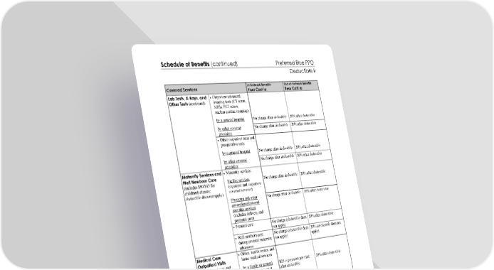Schedule of Benefits (continued) Preferred Blue PPO Deductible II This chart shows your cost share for covered services. You must pay all charges in excess of a benefit limit. Page 5 hppodedIISoB-0125 Covered Services In-Network Benefits Your Cost Is: Out-of-Network Benefits Your Cost Is: Outpatient advanced imaging tests (CT scans, MRIs, PET scans, nuclear cardiac imaging) by a general hospital No charge after deductible 20% after deductible by other covered providers No charge after deductible 20% after deductible Other outpatient tests and preoperative tests by a general hospital No charge after deductible 20% after deductible Lab Tests, X-Rays, and Other Tests (continued) by other covered providers No charge after deductible 20% after deductible Maternity services Facility services (inpatient and outpatient covered services) No charge after deductible 20% after deductible Physician and other covered professional provider services (includes delivery and postnatal care) No charge after deductible 20% after deductible Prenatal care No charge (deductible does not apply) 20% after deductible Maternity Services and Well Newborn Care (includes $90/$45 for childbirth classes; deductible does not apply) Well newborn care during covered maternity admission No charge (deductible does not apply) 20% (deductible does not apply) Office, health center, and home medical services Medical Care Outpatient Visits (includes syringes and needles dispensed during a visit) by a family or general practitioner, internist, OB/GYN physician, pediatrician, geriatric specialist, nurse midwife, limited services clinic, or multi-specialty provider group; or by a physician assistant or nurse practitioner designated by the health plan as primary care $25 copayment per visit after deductible 20% after deductible