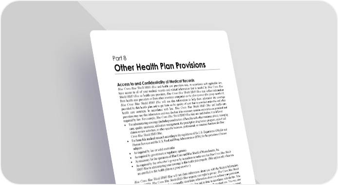 WORDS IN ITALICS ARE EXPLAINED IN PART 2. Page 78 Part 8 Other Health Plan Provisions Access to and Confidentiality of Medical Records Blue Cross Blue Shield HMO Blue and health care providers may, in accordance with applicable law, have access to all of your medical records and related information that is needed by Blue Cross Blue Shield HMO Blue or health care providers. Blue Cross Blue Shield HMO Blue may collect information from health care providers or from other insurance companies or the plan sponsor (for group members). Blue Cross Blue Shield HMO Blue will use this information to help them administer the coverage provided by this health plan and to get facts on the quality of care that is provided under this and other health care contracts. In accordance with law, Blue Cross Blue Shield HMO Blue and health care providers may use this information and may disclose it to necessary persons and entities as permitted and required by law. For example, Blue Cross Blue Shield HMO Blue may use and disclose it as follows: For administering coverage (including coordination of benefits with other insurance plans); managing care; quality assurance; utilization management; the prescription drug history program; appeal and claims review activities; or other specific business, professional, or insurance functions for Blue Cross Blue Shield HMO Blue. For bona fide medical research according to the regulations of the U.S. Department of Health and Human Services and the U.S. Food and Drug Administration (FDA) for the protection of human subjects. As required by law or valid court order. As required by government or regulatory agencies. As necessary for the operations of Blue Cross and Blue Shield of Massachusetts, Inc. As required by the subscriber’s group or by its auditors to make sure that Blue Cross Blue Shield HMO Blue is administering your coverage in this health plan properly. (This applies only when you are enrolled in this health plan as a group member.) Blue Cross Blue Shield HMO Blue will not share information about you with the Medical Information Bureau (MIB). Blue Cross Blue Shield HMO Blue respects your right to privacy. Blue Cross Blue Shield HMO Blue will not use or disclose personally identifiable information about you without your permission, unless the use or disclosure is permitted or required by law and is done in accordance with the law. You have the right to get the information Blue Cross Blue Shield HMO Blue collects about you. You may also ask Blue Cross Blue Shield HMO Blue to correct any of this information that you believe is not correct. Blue Cross Blue Shield HMO Blue may charge you a reasonable fee for copying your records, unless your request is because Blue Cross Blue Shield HMO Blue is declining or terminating your coverage in this health plan. Important Notice: To get a copy of Blue Cross Blue Shield HMO Blue’s Commitment to Confidentiality statement (“Notice of Privacy Practices”), call the Blue Cross Blue Shield HMO Blue customer service office. (See Part 1.) Acts of Providers Blue Cross Blue Shield HMO Blue is not liable for the acts or omissions by any individuals or institutions that furnish care or services to you. In addition, a health care provider who participates in your health care network and has a payment agreement with Blue Cross Blue Shield HMO Blue or any other health care