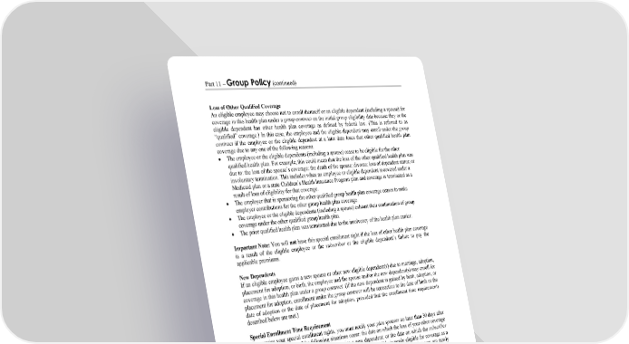 Part 11 – Group Policy (continued) WORDS IN ITALICS ARE EXPLAINED IN PART 2. Page 97 Loss of Other Qualified Coverage An eligible employee may choose not to enroll themself or an eligible dependent (including a spouse) for coverage in this health plan under a group contract on the initial group eligibility date because they or the eligible dependent has other health plan coverage as defined by federal law. (This is referred to as “qualified” coverage.) In this case, the employee and the eligible dependent may enroll under the group contract if the employee or the eligible dependent at a later date loses that other qualified health plan coverage due to any one of the following reasons. The employee or the eligible dependents (including a spouse) cease to be eligible for the other qualified health plan. For example, this could mean that the loss of the other qualified health plan was due to: the loss of the spouse’s coverage; the death of the spouse; divorce; loss of dependent status; or involuntary termination. This includes when an employee or eligible dependent is covered under a Medicaid plan or a state Children’s Health Insurance Program plan and coverage is terminated as a result of loss of eligibility for that coverage. The employer that is sponsoring the other qualified group health plan coverage ceases to make employer contributions for the other group health plan coverage. The employee or the eligible dependents (including a spouse) exhaust their continuation of group coverage under the other qualified group health plan. The prior qualified health plan was terminated due to the insolvency of the health plan carrier. Important Note: You will not have this special enrollment right if the loss of other health plan coverage is a result of the eligible employee or the subscriber or the eligible dependent’s failure to pay the applicable premiums. New Dependents If an eligible employee gains a new spouse or other new eligible dependent(s) due to marriage, adoption, placement for adoption, or birth, the employee and the spouse and/or the new dependent(s) may enroll for coverage in this health plan under a group contract. (If the new dependent is gained by birth, adoption, or placement for adoption, enrollment under the group contract will be retroactive to the date of birth or the date of adoption or the date of placement for adoption, provided that the enrollment time requirements described below are met.) Special Enrollment Time Requirement To exercise your special enrollment rights, you must notify your plan sponsor no later than 30 days after the date when any one of the following situations occur: the date on which the loss of your other coverage occurs or the date on which the subscriber gains a new dependent; or the date on which the subscriber receives notice that a dependent child who was not previously eligible is newly eligible for coverage as a result of changes to dependent eligibility; or the date on which you receive notice that you are newly eligible for coverage as a result of the elimination of a lifetime maximum. For example, if your coverage under another health plan is terminated, you must request enrollment for coverage in this health plan under a group contract within 30 days after your other health care coverage ends. Upon request, the plan sponsor will send you any special forms you may need. If you do not request enrollment within 30 days, you will have to wait until the group’s next open enrollment period to enroll under a group contract. You also have special enrollment rights related to termination of coverage under a state Children’s Health Insurance Program plan or a Medicaid plan or eligibility for assistance under a Medicaid plan or a state Children’s Health Insurance Program plan. When this situation applies, you must notify your plan sponsor to request coverage no later than 60 days after the coverage terminates or the employee or eligible dependent is determined to be eligible for assistance.