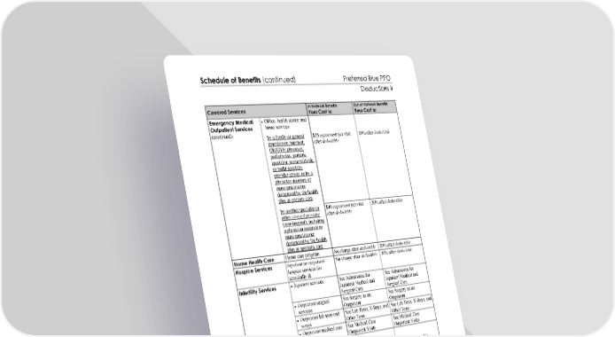 Schedule of Benefits (continued) Preferred Blue PPO Deductible II This chart shows your cost share for covered services. You must pay all charges in excess of a benefit limit. Page 4 hppodedIISoB-0125 Covered Services In-Network Benefits Your Cost Is: Out-of-Network Benefits Your Cost Is: Office, health center, and home services by a family or general practitioner, internist, OB/GYN physician, pediatrician, geriatric specialist, nurse midwife, or multi-specialty provider group; or by a physician assistant or nurse practitioner designated by the health plan as primary care $25 copayment per visit after deductible 20% after deductible Emergency Medical Outpatient Services (continued) by another specialist or other covered provider (non-hospital), including a physician assistant or nurse practitioner designated by the health plan as specialty care $40 copayment per visit after deductible 20% after deductible Home Health Care Home care program No charge after deductible 20% after deductible Hospice Services Inpatient or outpatient hospice services for terminally ill No charge after deductible 20% after deductible Inpatient services See Admissions for Inpatient Medical and Surgical Care See Admissions for Inpatient Medical and Surgical Care Outpatient surgical services See Surgery as an Outpatient See Surgery as an Outpatient Outpatient lab tests and x-rays See Lab Tests, X-Rays, and Other Tests See Lab Tests, X-Rays, and Other Tests Infertility Services Outpatient medical care services See Medical Care Outpatient Visits See Medical Care Outpatient Visits Outpatient lab tests by a general hospital No charge after deductible 20% after deductible by other covered providers No charge after deductible 20% after deductible Outpatient x-rays and other imaging tests (other than advanced imaging tests) by a general hospital No charge after deductible 20% after deductible Lab Tests, X-Rays, and Other Tests (diagnostic services) by other covered providers No charge after deductible 20% after deductible