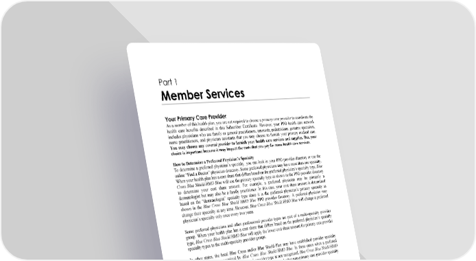 WORDS IN ITALICS ARE EXPLAINED IN PART 2. Page 2 Part 1 Member Services Your Primary Care Provider As a member of this health plan, you are not required to choose a primary care provider to coordinate the health care benefits described in this Subscriber Certificate. However, your PPO health care network includes physicians who are family or general practitioners, internists, pediatricians, geriatric specialists, nurse practitioners, and physician assistants that you may choose to furnish your primary medical care. You may choose any covered provider to furnish your health care services and supplies. But, your choice is important because it may impact the costs that you pay for some health care services. How to Determine a Preferred Physician’s Specialty To determine a preferred physician’s specialty, you can look in your PPO provider directory or use the online “Find a Doctor” physician directory. Some preferred physicians may have more than one specialty. When your health plan has a cost share that differs based on the preferred physician’s specialty type, Blue Cross Blue Shield HMO Blue will use the primary specialty type as shown in the PPO provider directory to determine your cost share amount. For example, a preferred physician may be primarily a dermatologist but may also be a family practitioner. In this case, your cost share amount is determined based on the “dermatologist” specialty type since it is the preferred physician’s primary specialty as shown in the Blue Cross Blue Shield HMO Blue PPO provider directory. A preferred physician may change their specialty at any time. However, Blue Cross Blue Shield HMO Blue will change a preferred physician’s specialty only once every two years. Some preferred physicians and other professional provider types are part of a multi-specialty provider group. When your health plan has a cost share that differs based on the preferred physician’s specialty type, Blue Cross Blue Shield HMO Blue will apply the lower cost share amount for primary care provider specialty types to the multi-specialty provider groups. In other states, the local Blue Cross and/or Blue Shield Plan may have established provider specialty types that are not recognized by Blue Cross Blue Shield HMO Blue. In those cases when a preferred physician’s specialty type or professional provider type is not recognized, Blue Cross Blue Shield HMO Blue will apply the higher cost share amount for specialists and other non-primary care provider specialty types. Refer to the Schedule of Benefits for your plan option to see if your cost share amount is based on a preferred physician’s specialty type or other provider type. Your Health Care Network This health plan consists of two benefit levels: one for in-network benefits; and one for out-of-network benefits. The costs that you pay for covered services will differ based on the benefit level. To receive the highest benefit level (your in-network benefits), you must obtain your health care services and supplies from providers who participate in your PPO health care network. These health care providers are referred to as “preferred providers.” (See “covered providers” in Part 2.) If you choose to obtain your health care services and supplies from a covered provider who does not participate in this PPO health care network, you will usually receive the lowest benefit level (your out-of-network benefits). See Part 8 in this