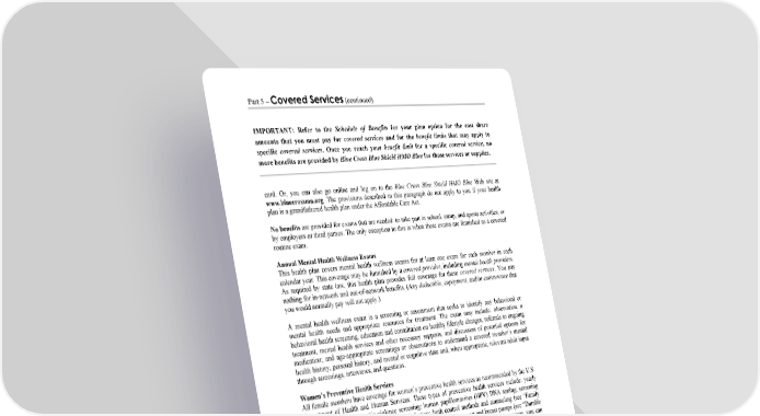 Part 5 – Covered Services (continued) IMPORTANT: Refer to the Schedule of Benefits for your plan option for the cost share amounts that you must pay for covered services and for the benefit limits that may apply to specific covered services. Once you reach your benefit limit for a specific covered service, no more benefits are provided by Blue Cross Blue Shield HMO Blue for those services or supplies. WORDS IN ITALICS ARE EXPLAINED IN PART 2. Page 61 card. Or, you can also go online and log on to the Blue Cross Blue Shield HMO Blue Web site at www.bluecrossma.org. The provisions described in this paragraph do not apply to you if your health plan is a grandfathered health plan under the Affordable Care Act. No benefits are provided for exams that are needed: to take part in school, camp, and sports activities; or by employers or third parties. The only exception to this is when these exams are furnished as a covered routine exam. Annual Mental Health Wellness Exams This health plan covers mental health wellness exams for at least one exam for each member in each calendar year. This coverage may be furnished by a covered provider, including mental health providers. As required by state law, this health plan provides full coverage for these covered services. You pay nothing for in-network and out-of-network benefits. (Any deductible, copayment, and/or coinsurance that you would normally pay will not apply.) A mental health wellness exam is a screening or assessment that seeks to identify any behavioral or mental health needs and appropriate resources for treatment. The exam may include: observation, a behavioral health screening, education and consultation on healthy lifestyle changes, referrals to ongoing treatment, mental health services and other necessary supports, and discussion of potential options for medication; and age-appropriate screenings or observations to understand a covered member’s mental health history, personal history, and mental or cognitive state and, when appropriate, relevant adult input through screenings, interviews, and questions. Women’s Preventive Health Services All female members have coverage for women’s preventive health services as recommended by the U.S. Department of Health and Human Services. These types of preventive health services include: yearly well-woman visits; domestic violence screening; human papillomavirus (HPV) DNA testing; screening for human immunodeficiency virus (HIV) infection; birth control methods and counseling (see “Family Planning”); screening for gestational diabetes; and breastfeeding support and breast pumps (see “Durable Medical Equipment”). For a complete description of these covered preventive health services, you can call the Blue Cross Blue Shield HMO Blue customer service office at the toll free phone number shown on your ID card. Or, you can also go online and log on to the Blue Cross Blue Shield HMO Blue Web site at www.bluecrossma.org. Your coverage for these preventive health services is subject to all of the provisions and requirements of this health plan. See other sections of your Subscriber Certificate to understand the provisions related to your coverage for prenatal care, routine GYN exams, family planning, and pharmacy benefits for birth control drugs and devices when you have prescription drug coverage under this health plan. Routine Gynecological (GYN) Exams This health plan covers one routine GYN exam for each member in each calendar year when it is furnished by a covered provider. This may include (but is not limited to): a physician; or a nurse practitioner; or a nurse midwife. This coverage also includes one routine Pap smear test for each member in each calendar year.