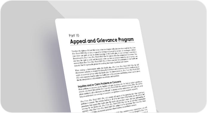 WORDS IN ITALICS ARE EXPLAINED IN PART 2. Page 87 Part 10 Appeal and Grievance Program You have the right to a full and fair review when you disagree with a decision that is made by Blue Cross Blue Shield HMO Blue to deny a request for coverage or payment for services; or you disagree with how your claim was paid; or you are denied coverage in this health plan; or your coverage is canceled or discontinued by Blue Cross Blue Shield HMO Blue for reasons other than nonpayment of premium. You also have the right to a full and fair review when you have a complaint about the care or service you received from Blue Cross Blue Shield HMO Blue or from a provider who participates in your health care network. Part 10 explains the process for handling these types of problems and concerns. When making a determination under this health plan, Blue Cross Blue Shield HMO Blue has full discretionary authority to interpret this Subscriber Certificate and to determine whether a health service or supply is a covered service under this health plan. All determinations by Blue Cross Blue Shield HMO Blue with respect to benefits under this health plan will be conclusive and binding unless it can be shown that the interpretation or determination was arbitrary and capricious. Inquiries and/or Claim Problems or Concerns Most problems or concerns can be handled with just one phone call. For help to resolve a problem or concern, you should first call the Blue Cross Blue Shield HMO Blue customer service office. The toll free phone number to call is shown on your ID card. A customer service representative will work with you to help you understand your coverage or to resolve your problem or concern as quickly as possible. Blue Cross Blue Shield HMO Blue will consider all aspects of the particular case when resolving a problem or concern. This includes looking at: all of the provisions of this health plan; the policies and procedures that support this health plan; the health care provider’s input; and your understanding of coverage by this health plan. Blue Cross Blue Shield HMO Blue may use an individual consideration approach when Blue Cross Blue Shield HMO Blue judges it to be appropriate. Blue Cross Blue Shield HMO Blue will follow its standard guidelines when it resolves your problem or concern. If after speaking with a Blue Cross Blue Shield HMO Blue customer service representative, you still disagree with a decision that is given to you, you may request a formal review through the Blue Cross Blue Shield HMO Blue Member Appeal and Grievance Program. You may also request a formal review if Blue Cross Blue Shield HMO Blue has not responded to you within three working days of receiving your inquiry. If this does happen, Blue Cross Blue Shield HMO Blue will notify you and let you know the steps you may follow to request a formal review. Appeal and Grievance Review Process Internal Formal Review How to Request an Internal Formal Appeal or Grievance Review To request an internal formal appeal or grievance review, you (or your authorized or legal representative) have three options: To write or send a fax. The preferred option is for you to send your request for an appeal or a grievance review in writing to: Member Appeal and Grievance Program, Blue Cross Blue Shield
