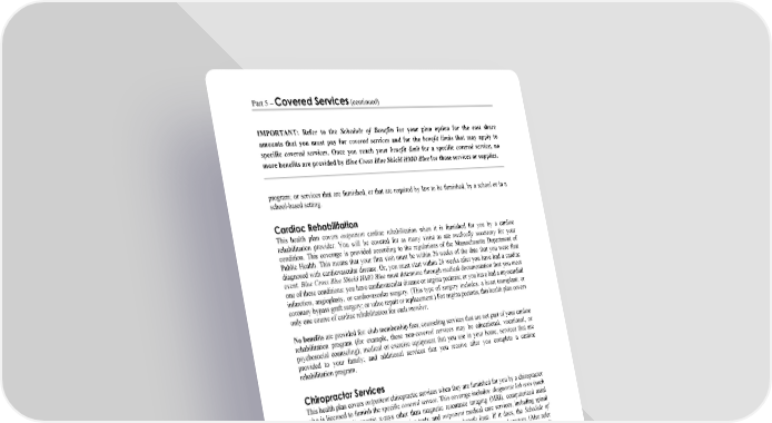 Part 5 – Covered Services (continued) IMPORTANT: Refer to the Schedule of Benefits for your plan option for the cost share amounts that you must pay for covered services and for the benefit limits that may apply to specific covered services. Once you reach your benefit limit for a specific covered service, no more benefits are provided by Blue Cross Blue Shield HMO Blue for those services or supplies. WORDS IN ITALICS ARE EXPLAINED IN PART 2. Page 38 program; or services that are furnished, or that are required by law to be furnished, by a school or in a school-based setting. Cardiac Rehabilitation This health plan covers outpatient cardiac rehabilitation when it is furnished for you by a cardiac rehabilitation provider. You will be covered for as many visits as are medically necessary for your condition. This coverage is provided according to the regulations of the Massachusetts Department of Public Health. This means that your first visit must be within 26 weeks of the date that you were first diagnosed with cardiovascular disease. Or, you must start within 26 weeks after you have had a cardiac event. Blue Cross Blue Shield HMO Blue must determine through medical documentation that you meet one of these conditions: you have cardiovascular disease or angina pectoris; or you have had a myocardial infarction, angioplasty, or cardiovascular surgery. (This type of surgery includes: a heart transplant; or coronary bypass graft surgery; or valve repair or replacement.) For angina pectoris, this health plan covers only one course of cardiac rehabilitation for each member. No benefits are provided for: club membership fees; counseling services that are not part of your cardiac rehabilitation program (for example, these non-covered services may be educational, vocational, or psychosocial counseling); medical or exercise equipment that you use in your home; services that are provided to your family; and additional services that you receive after you complete a cardiac rehabilitation program. Chiropractor Services This health plan covers outpatient chiropractic services when they are furnished for you by a chiropractor who is licensed to furnish the specific covered service. This coverage includes: diagnostic lab tests (such as blood tests); diagnostic x-rays other than magnetic resonance imaging (MRI), computerized axial tomography (CT scans), and other imaging tests; and outpatient medical care services, including spinal manipulation. Your coverage for these services may have a benefit limit. If it does, the Schedule of Benefits for your plan option describes the benefit limit that applies for these covered services. (Also refer to riders—if there are any—that apply to your coverage in this health plan.) Once you reach this benefit limit, no more benefits will be provided for these services. This is the case whether or not the service is medically necessary. Cleft Lip and Cleft Palate Treatment This health plan covers services to treat conditions of cleft lip and cleft palate for a member who is under age 18 (from birth through age 17). To receive coverage, these services must be furnished by a covered provider such as: a physician; a dentist; a nurse practitioner; a physician assistant; a licensed speech-language pathologist; a licensed audiologist; a licensed dietitian nutritionist; or a covered provider who has a recognized expertise in specialty pediatrics. These services may be furnished in the provider’s office or at a hospital or other covered facility. This coverage includes: Medical, dental, oral, and facial surgery. Surgical management and follow-up care by oral and plastic surgeons.