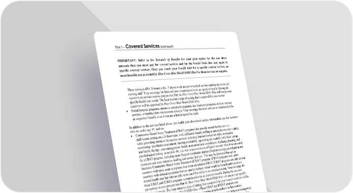 Part 5 – Covered Services (continued) IMPORTANT: Refer to the Schedule of Benefits for your plan option for the cost share amounts that you must pay for covered services and for the benefit limits that may apply to specific covered services. Once you reach your benefit limit for a specific covered service, no more benefits are provided by Blue Cross Blue Shield HMO Blue for those services or supplies. WORDS IN ITALICS ARE EXPLAINED IN PART 2. Page 51 These services offer 24 hours a day, 7 days a week access to medical services and on-site or on-call nursing staff. Your coverage for these services is considered to be an inpatient benefit. During the inpatient pre-service review process (see Part 4), Blue Cross Blue Shield HMO Blue will assess your specific health care needs. The least intensive type of setting that is required for your mental condition will be approved by Blue Cross Blue Shield HMO Blue. Partial hospital programs, intensive outpatient programs, day treatment programs, in-home therapy services, or mobile crisis intervention services. Your coverage for these services is considered to be an outpatient benefit, even if you use a bed or spend the night. In addition to the services listed above, this health plan also covers certain intermediate care for members who are under age 19, such as: Community-Based Acute Treatment (CBAT) programs that provide mental health care in a staff-secure setting on a 24-hour basis, with sufficient clinical staffing to ensure the member’s safety, while providing intensive therapeutic services including (but not limited to): daily medication monitoring; psychiatric assessment; nursing availability; specialing (as needed); individual, group, and family therapy; case management; family assessment and consultation; discharge planning; and psychological testing, as needed. Or, you may require services of higher intensity than those provided by a CBAT program, including more frequent psychiatric and psychopharmacological evaluation and treatment and more intensive staffing and service delivery. This may be delivered through an Intensive Community-Based Acute Treatment (ICBAT) program. ICBAT programs may admit members with more acute symptoms than those admitted to CBAT. ICBAT programs are able to treat members with clinical symptoms that are similar to those which would be treated under inpatient mental health care but who are able to be cared for safely in an unlocked setting. Your coverage for these CBAT and ICBAT programs is considered to be an inpatient benefit. During the inpatient pre-service review process (see Part 4), Blue Cross Blue Shield HMO Blue will assess your specific health care needs. The least intensive type of setting that is required for your mental condition will be approved by Blue Cross Blue Shield HMO Blue. (These CBAT and ICBAT programs are substantially similar to acute residential treatment programs described above in this section.) In-home behavioral services that provide a combination of medically necessary behavior management therapy and behavior management monitoring. These services may be furnished where the member resides, including in the member’s home, a foster home, a therapeutic foster home, or another community setting. Behavior management monitoring is the monitoring of behavior, the implementation of a behavior plan, and reinforcing the implementation of a behavior plan by the member’s parent or other caregiver. Behavior management therapy addresses challenging behaviors that interfere with a member’s successful functioning. Behavior management therapy includes: a functional behavioral assessment and observation of the member in the home and/or community setting; development of a behavior plan; and supervision and coordination of interventions to address specific behavioral goals or performance, including the development of a crisis-response strategy. Behavior management therapy may also include short-term counseling and assistance. Your coverage for these services is considered to be an outpatient benefit. In-Home Therapy services that provide medically necessary therapeutic clinical intervention or ongoing therapeutic training and support. These services are furnished where the member resides, including in the member’s home, a foster home, a therapeutic foster home, or another community