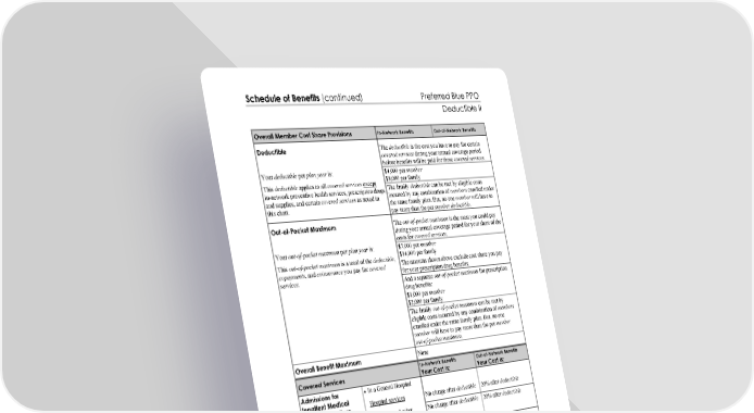 Schedule of Benefits (continued) Preferred Blue PPO Deductible II This chart shows your cost share for covered services. You must pay all charges in excess of a benefit limit. Page 2 hppodedIISoB-0125 Overall Member Cost Share Provisions In-Network Benefits Out-of-Network Benefits Deductible The deductible is the cost you have to pay for certain covered services during your annual coverage period before benefits will be paid for those covered services. $4,000 per member $8,000 per family Your deductible per plan year is: This deductible applies to all covered services except in-network preventive health services, prescription drugs and supplies, and certain covered services as noted in this chart. The family deductible can be met by eligible costs incurred by any combination of members enrolled under the same family plan. But, no one member will have to pay more than the per member deductible. Out-of-Pocket Maximum The out-of-pocket maximum is the most you could pay during your annual coverage period for your share of the costs for covered services. $7,000 per member $14,000 per family The amounts shown above exclude cost share you pay for your prescription drug benefits. And a separate out-of-pocket maximum for prescription drug benefits: $1,000 per member $2,000 per family Your out-of-pocket maximum per plan year is: This out-of-pocket maximum is a total of the deductible, copayments, and coinsurance you pay for covered services. The family out-of-pocket maximum can be met by eligible costs incurred by any combination of members enrolled under the same family plan. But, no one member will have to pay more than the per member out-of-pocket maximum. Overall Benefit Maximum None Covered Services In-Network Benefits Your Cost Is: Out-of-Network Benefits Your Cost Is: In a General Hospital Hospital services No charge after deductible 20% after deductible Physician and other covered professional provider services No charge after deductible 20% after deductible In a Chronic Disease Hospital (same as admissions in a General Hospital) (same as admissions in a General Hospital) In a Rehabilitation Hospital (60-day benefit limit per member per calendar year) Hospital services No charge after deductible 20% after deductible Admissions for Inpatient Medical and Surgical Care Physician and other covered professional provider services No charge after deductible 20% after deductible