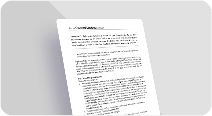Part 5 – Covered Services (continued) IMPORTANT: Refer to the Schedule of Benefits for your plan option for the cost share amounts that you must pay for covered services and for the benefit limits that may apply to specific covered services. Once you reach your benefit limit for a specific covered service, no more benefits are provided by Blue Cross Blue Shield HMO Blue for those services or supplies. WORDS IN ITALICS ARE EXPLAINED IN PART 2. Page 58 coinsurance for these covered drugs will not be more than 20%.) For auto injection devices for these covered drugs, you will have to pay your cost share. Important Note: Any in-network deductible, copayment, and/or coinsurance (whichever applies to you) will be waived for certain preventive drugs as recommended and supported by the Health Resources and Services Administration and the U.S. Preventive Services Task Force. (If out-of-network coinsurance applies for drugs and supplies, your out-of-network coinsurance for these covered drugs will not be more than 20%.) The provisions described in this paragraph do not apply to you if your health plan is a grandfathered health plan under the Affordable Care Act. Non-Covered Drugs and Supplies No benefits are provided for: Anorexiants; non-sedating antihistamines; ophthalmic drug solutions to treat allergies; inhaled topical nasal steroids; or proton pump inhibitors, except for prescription proton pump inhibitors that are prescribed for members under age 18 or that are prescribed as part of a combination drug used to treat helicobacter pylori. From time to time, Blue Cross Blue Shield HMO Blue may change this list of non-covered drugs and supplies. When a material change is made to this list of non-covered drugs and supplies, Blue Cross Blue Shield HMO Blue will let the subscriber (or the subscriber’s group on your behalf when you are enrolled in this health plan as a group member) know about the change at least 60 days before the change becomes effective. For more information, you can call the Blue Cross Blue Shield HMO Blue customer service office. The toll free phone number to call is shown on your ID card. Or, you can also go online and log on to the Blue Cross Blue Shield HMO Blue Web site at www.bluecrossma.org. Pharmaceuticals that you can buy without a prescription, except as described in this Subscriber Certificate or in your Pharmacy Program booklet. Medical supplies such as dressings and antiseptics. The cost of delivering drugs to you. Combination vitamins that require a prescription, except for: prescription prenatal vitamins; and pediatric vitamins with fluoride. Drugs and supplies that you buy from a non-designated mail order pharmacy. Drugs and supplies that you buy from any pharmacy that is not approved by Blue Cross Blue Shield HMO Blue for payment for the specific covered drug and/or supply. Preventive Health Services In this Subscriber Certificate, the term “preventive health services” refers to covered services that are performed to prevent diseases (or injuries) rather than to diagnose or treat a symptom or complaint, or to treat or cure a disease after it is present. This health plan provides coverage for preventive health services in accordance with applicable federal and state laws and regulations. Routine Pediatric Care This health plan covers routine pediatric care that is furnished by a covered provider and is in line with applicable Blue Cross Blue Shield HMO Blue medical policies. This coverage is limited to an age-based