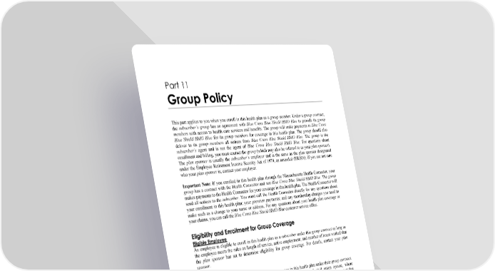 WORDS IN ITALICS ARE EXPLAINED IN PART 2. Page 94 Part 11 Group Policy This part applies to you when you enroll in this health plan as a group member. Under a group contract, the subscriber’s group has an agreement with Blue Cross Blue Shield HMO Blue to provide its group members with access to health care services and benefits. The group will make payments to Blue Cross Blue Shield HMO Blue for its group members for coverage in this health plan. The group should also deliver to its group members all notices from Blue Cross Blue Shield HMO Blue. The group is the subscriber’s agent and is not the agent of Blue Cross Blue Shield HMO Blue. For questions about enrollment and billing, you must contact the group (which may also be referred to as your plan sponsor). The plan sponsor is usually the subscriber’s employer and is the same as the plan sponsor designated under the Employee Retirement Income Security Act of 1974, as amended (ERISA). If you are not sure who your plan sponsor is, contact your employer. Important Note: If you enrolled in this health plan through the Massachusetts Health Connector, your group has a contract with the Health Connector and not Blue Cross Blue Shield HMO Blue. The group makes payments to the Health Connector for your coverage in this health plan. The Health Connector will send all notices to the subscriber. You must call the Health Connector directly for any questions about: your enrollment in this health plan; your premium payments; and any membership changes you need to make such as a change to your name or address. For any questions about your health plan coverage or your claims, you can call the Blue Cross Blue Shield HMO Blue customer service office. Eligibility and Enrollment for Group Coverage Eligible Employee An employee is eligible to enroll in this health plan as a subscriber under this group contract as long as the employee meets the rules on length of service, active employment, and number of hours worked that the plan sponsor has set to determine eligibility for group coverage. For details, contact your plan sponsor. Eligible Spouse The subscriber may enroll an eligible spouse for coverage in this health plan under their group contract. An “eligible spouse” includes the subscriber’s legal spouse. (A legal civil union spouse, where applicable, is eligible to enroll for coverage in this health plan under the group contract to the extent that a legal civil union spouse is determined eligible by the plan sponsor. For more details, contact your plan sponsor.) Former Spouse In the event of a divorce or a legal separation, the person who was the spouse of the subscriber prior to the divorce or legal separation will remain eligible for coverage in this health plan under the subscriber’s group contract, whether or not the judgment was entered prior to the effective date of the group contract. This health plan coverage is provided with no additional premium other than the normal cost of covering a current spouse. The former spouse will remain eligible for this coverage only until the subscriber is no longer required by the judgment to provide health insurance for the former spouse or the subscriber or former spouse remarries, whichever comes first. In these situations, Blue Cross Blue Shield HMO Blue must be notified within 30 days of a change to the former spouse’s address. Otherwise, Blue Cross Blue