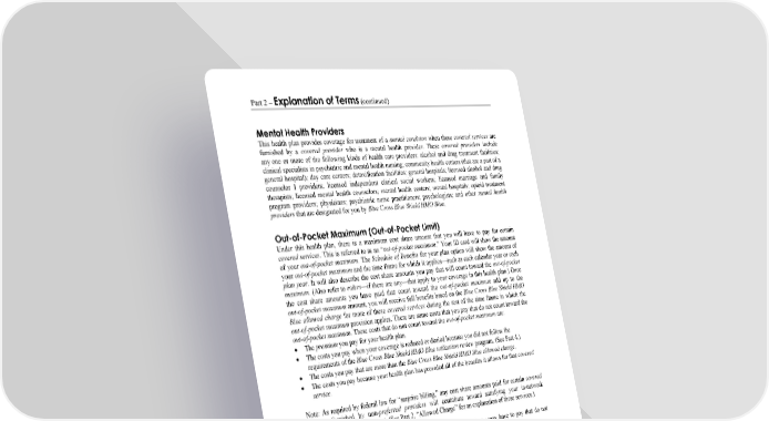Part 2 – Explanation of Terms (continued) WORDS IN ITALICS ARE EXPLAINED IN PART 2. Page 20 Mental Health Providers This health plan provides coverage for treatment of a mental condition when these covered services are furnished by a covered provider who is a mental health provider. These covered providers include any one or more of the following kinds of health care providers: alcohol and drug treatment facilities; clinical specialists in psychiatric and mental health nursing; community health centers (that are a part of a general hospital); day care centers; detoxification facilities; general hospitals; licensed alcohol and drug counselor I providers; licensed independent clinical social workers; licensed marriage and family therapists; licensed mental health counselors; mental health centers; mental hospitals; opioid treatment program providers; physicians; psychiatric nurse practitioners; psychologists; and other mental health providers that are designated for you by Blue Cross Blue Shield HMO Blue. Out-of-Pocket Maximum (Out-of-Pocket Limit) Under this health plan, there is a maximum cost share amount that you will have to pay for certain covered services. This is referred to as an “out-of-pocket maximum.” Your ID card will show the amount of your out-of-pocket maximum. The Schedule of Benefits for your plan option will show the amount of your out-of-pocket maximum and the time frame for which it applies—such as each calendar year or each plan year. It will also describe the cost share amounts you pay that will count toward the out-of-pocket maximum. (Also refer to riders—if there are any—that apply to your coverage in this health plan.) Once the cost share amounts you have paid that count toward the out-of-pocket maximum add up to the out-of-pocket maximum amount, you will receive full benefits based on the Blue Cross Blue Shield HMO Blue allowed charge for more of these covered services during the rest of the time frame in which the out-of-pocket maximum provision applies. There are some costs that you pay that do not count toward the out-of-pocket maximum. These costs that do not count toward the out-of-pocket maximum are: The premium you pay for your health plan. The costs you pay when your coverage is reduced or denied because you did not follow the requirements of the Blue Cross Blue Shield HMO Blue utilization review program. (See Part 4.) The costs you pay that are more than the Blue Cross Blue Shield HMO Blue allowed charge. The costs you pay because your health plan has provided all of the benefits it allows for that covered service. Note: As required by federal law for “surprise billing,” any cost share amounts paid for certain covered services furnished by non-preferred providers will contribute toward satisfying your in-network out-of-pocket maximum amount. (See Part 2, “Allowed Charge” for an explanation of these services.) See the Schedule of Benefits for your plan option for other costs that you may have to pay that do not count toward your out-of-pocket maximum. The out-of-pocket maximum is indexed to the average national premium growth and the amount may be increased annually. This means that your out-of-pocket maximum amount may increase from time to time, as determined by Blue Cross Blue Shield HMO Blue. Blue Cross Blue Shield HMO Blue will notify you if this happens. However, the amount of your out-of-pocket maximum will never be more than the maximum out-of-pocket maximum amount allowed under applicable law. Outpatient The term “outpatient” refers to your status as a patient. Your status is important because it affects how much you will pay for covered services. You are an outpatient if you are getting emergency room services, observation services, outpatient day surgery, or other hospital services such as lab tests or x-rays and the doctor has not written an order to admit you to the hospital or health care facility as an inpatient.