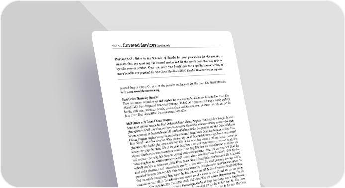 Part 5 – Covered Services (continued) IMPORTANT: Refer to the Schedule of Benefits for your plan option for the cost share amounts that you must pay for covered services and for the benefit limits that may apply to specific covered services. Once you reach your benefit limit for a specific covered service, no more benefits are provided by Blue Cross Blue Shield HMO Blue for those services or supplies. WORDS IN ITALICS ARE EXPLAINED IN PART 2. Page 56 covered drug or supply. Or, you can also go online and log on to the Blue Cross Blue Shield HMO Blue Web site at www.bluecrossma.org. Mail Order Pharmacy Benefits There are certain covered drugs and supplies that you may not be able to buy from the Blue Cross Blue Shield HMO Blue designated mail order pharmacy. To find out if your covered drug or supply qualifies for the mail order pharmacy benefit, you can check with the mail order pharmacy. Or, you can call the Blue Cross Blue Shield HMO Blue customer service office. Mail Order with Retail Choice Program Some plan options include the Mail Order with Retail Choice Program. The Schedule of Benefits for your plan option will tell you when you have this program. (Also refer to riders—if there are any—that apply to your coverage in this health plan.) If your health plan includes this program, the Mail Order with Retail Choice Program applies for certain covered maintenance drugs. These drugs are shown on the Blue Cross Blue Shield HMO Blue drug list. When you buy any one of these maintenance drugs from a covered retail pharmacy, this health plan covers only two fills of the same drug within a 365-day period. In order to receive coverage for more fills of the same drug from a covered retail pharmacy, you will be asked to choose whether you want to continue to receive your drug fills from the retail pharmacy or whether you will receive your drug fills from the covered mail order pharmacy. After you buy your first fill of the listed drug from the retail pharmacy, you will receive a letter from Blue Cross Blue Shield HMO Blue that will tell you how to make your choice. If you do not make a choice before you buy a third fill, the covered mail order pharmacy will automatically qualify as your choice. No retail pharmacy coverage will be provided for more than two fills of the same drug unless you have chosen the retail pharmacy option. To find out which maintenance drugs are on the drug list, you can call the Blue Cross Blue Shield HMO Blue customer service office. The toll free phone number to call is shown on your ID card. Or, you can also go online and log on to the Blue Cross Blue Shield HMO Blue Web site at www.bluecrossma.org. This list of drugs may change from time to time. For example, this list of drugs may change as new drugs become available. Please check for updates when a drug is prescribed for you for the first time. Or, Blue Cross Blue Shield HMO Blue may change the classes of drugs that are on this drug list. In this case, Blue Cross Blue Shield HMO Blue will send you a notice. Covered Drugs and Supplies This drug coverage is provided for:  Drugs that require a prescription by law and are furnished in accordance with Blue Cross Blue Shield HMO Blue medical technology assessment criteria. These covered drugs include, but are not limited to: birth control drugs; oral diabetes medication that influences blood sugar levels; hormone replacement therapy drugs for peri- and post-menopausal members; certain drugs used on an off-label basis (such as: drugs used to treat cancer; and drugs used to treat HIV/AIDS); abuse-deterrent opioid drug products on a basis not less favorable than non-abuse deterrent opioid drug products; oral antibiotics for the treatment of Lyme disease; and drugs for HIV associated lipodystrophy syndrome.  Injectable insulin and disposable syringes and needles needed for its administration, whether or not a prescription is required. (When a copayment applies to your pharmacy coverage, if insulin, syringes,