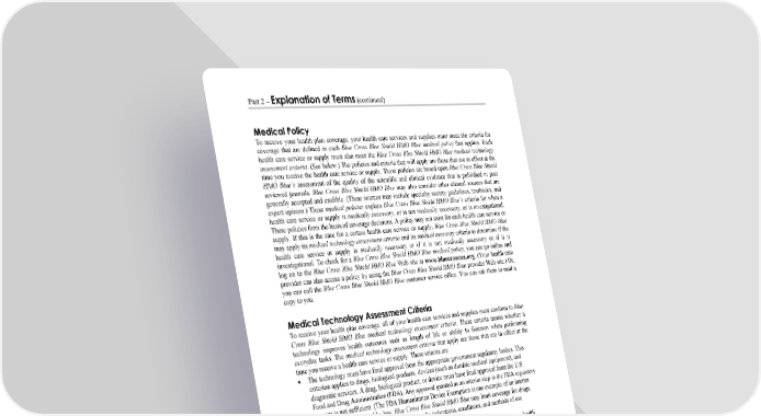 Part 2 – Explanation of Terms (continued) WORDS IN ITALICS ARE EXPLAINED IN PART 2. Page 18 Medical Policy To receive your health plan coverage, your health care services and supplies must meet the criteria for coverage that are defined in each Blue Cross Blue Shield HMO Blue medical policy that applies. Each health care service or supply must also meet the Blue Cross Blue Shield HMO Blue medical technology assessment criteria. (See below.) The policies and criteria that will apply are those that are in effect at the time you receive the health care service or supply. These policies are based upon Blue Cross Blue Shield HMO Blue’s assessment of the quality of the scientific and clinical evidence that is published in peer reviewed journals. Blue Cross Blue Shield HMO Blue may also consider other clinical sources that are generally accepted and credible. (These sources may include specialty society guidelines, textbooks, and expert opinion.) These medical policies explain Blue Cross Blue Shield HMO Blue’s criteria for when a health care service or supply is medically necessary, or is not medically necessary, or is investigational. These policies form the basis of coverage decisions. A policy may not exist for each health care service or supply. If this is the case for a certain health care service or supply, Blue Cross Blue Shield HMO Blue may apply its medical technology assessment criteria and its medical necessity criteria to determine if the health care service or supply is medically necessary or if it is not medically necessary or if it is investigational. To check for a Blue Cross Blue Shield HMO Blue medical policy, you can go online and log on to the Blue Cross Blue Shield HMO Blue Web site at www.bluecrossma.org. (Your health care provider can also access a policy by using the Blue Cross Blue Shield HMO Blue provider Web site.) Or, you can call the Blue Cross Blue Shield HMO Blue customer service office. You can ask them to mail a copy to you. Medical Technology Assessment Criteria To receive your health plan coverage, all of your health care services and supplies must conform to Blue Cross Blue Shield HMO Blue medical technology assessment criteria. These criteria assess whether a technology improves health outcomes such as length of life or ability to function when performing everyday tasks. The medical technology assessment criteria that apply are those that are in effect at the time you receive a health care service or supply. These criteria are: The technology must have final approval from the appropriate government regulatory bodies. This criterion applies to drugs, biological products, devices (such as durable medical equipment), and diagnostic services. A drug, biological product, or device must have final approval from the U.S. Food and Drug Administration (FDA). Any approval granted as an interim step in the FDA regulatory process is not sufficient. (The FDA Humanitarian Device Exemption is one example of an interim step.) Except as required by law, Blue Cross Blue Shield HMO Blue may limit coverage for drugs, biological products, and devices to those specific indications, conditions, and methods of use approved by the FDA. The scientific evidence must permit conclusions concerning the effect of the technology on health outcomes. The evidence should consist of well-designed and well-conducted investigations published in peer-reviewed English-language journals. The qualities of the body of studies and the consistency of the results are considered in evaluating the evidence. The evidence should demonstrate that the technology can measurably alter the physiological changes related to a disease, injury, illness, or condition. In addition, there should be evidence or a convincing argument based on established medical facts that the measured alterations affect health outcomes. Opinions and evaluations by national medical associations, consensus panels, and other technology evaluation bodies are evaluated according to the scientific quality of the supporting evidence upon which they are based. The technology must improve the net health outcome. The technology’s beneficial effects on health outcomes should outweigh any harmful effects on health outcomes. The technology must be as beneficial as any established alternatives. The technology should improve the net outcome as much as or more than established alternatives. The technology must be as cost effective as any established alternative that achieves a similar health outcome.