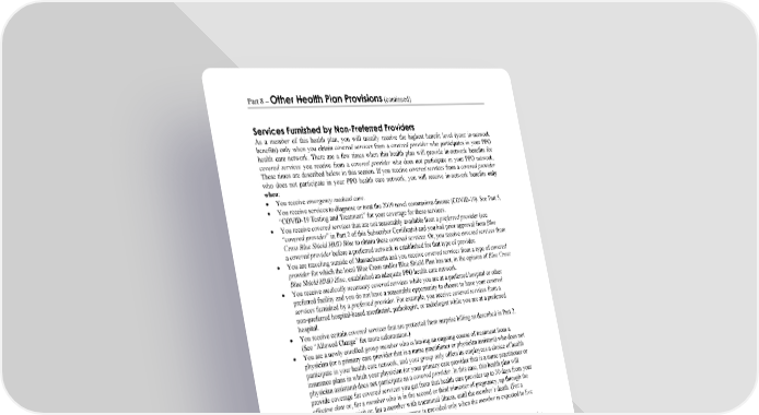 Part 8 – Other Health Plan Provisions (continued) WORDS IN ITALICS ARE EXPLAINED IN PART 2. Page 83 Services Furnished by Non-Preferred Providers As a member of this health plan, you will usually receive the highest benefit level (your in-network benefits) only when you obtain covered services from a covered provider who participates in your PPO health care network. There are a few times when this health plan will provide in-network benefits for covered services you receive from a covered provider who does not participate in your PPO network. These times are described below in this section. If you receive covered services from a covered provider who does not participate in your PPO health care network, you will receive in-network benefits only when:  You receive emergency medical care.  You receive services to diagnose or treat the 2019 novel coronavirus disease (COVID-19). See Part 5, “COVID-19 Testing and Treatment” for your coverage for these services.  You receive covered services that are not reasonably available from a preferred provider (see “covered provider” in Part 2 of this Subscriber Certificate) and you had prior approval from Blue Cross Blue Shield HMO Blue to obtain these covered services. Or, you receive covered services from a covered provider before a preferred network is established for that type of provider.  You are traveling outside of Massachusetts and you receive covered services from a type of covered provider for which the local Blue Cross and/or Blue Shield Plan has not, in the opinion of Blue Cross Blue Shield HMO Blue, established an adequate PPO health care network.  You receive medically necessary covered services while you are at a preferred hospital or other preferred facility and you do not have a reasonable opportunity to choose to have your covered services furnished by a preferred provider. For example, you receive covered services from a non-preferred hospital-based anesthetist, pathologist, or radiologist while you are at a preferred hospital.  You receive certain covered services that are protected from surprise billing as described in Part 2. (See “Allowed Charge” for more information.)  You are a newly enrolled group member who is having an ongoing course of treatment from a physician (or a primary care provider that is a nurse practitioner or physician assistant) who does not participate in your health care network, and your group only offers its employees a choice of health insurance plans in which your physician (or your primary care provider that is a nurse practitioner or physician assistant) does not participate as a covered provider. In this case, this health plan will provide coverage for covered services you get from that health care provider up to 30 days from your effective date or, for a member who is in the second or third trimester of pregnancy, up through the first post-partum visit or, for a member with a terminal illness, until the member’s death. (For a member with a terminal illness, this coverage is provided only when the member is expected to live six months or less as determined by a physician.) This health plan will also provide in-network benefits in the event Medicare is your primary payor (as allowed by federal law) and you receive covered services from a non-preferred provider outside of Massachusetts and that provider accepts Medicare assignment, whether or not the provider participates with the local Blue Cross and/or Blue Shield Plan. (Medicare assignment is an agreement by the provider to accept the Medicare-approved amount as payment in full for services furnished.) When Your Provider Disenrolls (or is Involuntarily Disenrolled) From the Network If your provider disenrolls from the network for a reason other than a quality-related reason or fraud, this health plan will provide coverage for covered services that you receive from a health care provider who does not participate in your health care network. As required by law, this continuity of care coverage is described below in this section. If you receive covered services from a covered health care provider who does not participate in your health care network, you may receive coverage from this health plan only when: