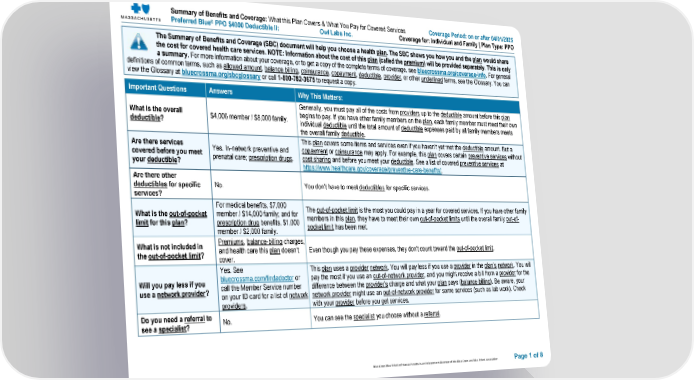 Your Rights to Continue Coverage: There are agencies that can help if you want to continue your coverage after it ends. The contact information for those agencies is: the U.S. Department of Labor, Employee Benefits Security Administration at 1-866-444-EBSA (3272) or www.dol.gov/ebsa/healthreform and the U.S. Department of Health and Human Services at 1-877-267-2323 x61565 or www.cciio.cms.gov. Your state insurance department might also be able to help. If you are a Massachusetts resident, you can contact the Massachusetts Division of Insurance at 1-877-563-4467 or www.mass.gov/doi. Other coverage options may be available to you too, including buying individual insurance coverage through the Health Insurance Marketplace. For more information about the Marketplace, visit www.HealthCare.gov or call 1-800-318-2596. For more information about possibly buying individual coverage through a state exchange, you can contact your state’s marketplace, if applicable. If you are a Massachusetts resident, contact the Massachusetts Health Connector by visiting www.mahealthconnector.org. For more information on your rights to continue your employer coverage, contact your plan sponsor. (A plan sponsor is usually the member’s employer or organization that provides group health coverage to the member.) Your Grievance and Appeals Rights: There are agencies that can help if you have a complaint against your plan for a denial of a claim. This complaint is called a grievance or appeal. For more information about your rights, look at the explanation of benefits you will receive for that medical claim. Your plan documents also provide complete information on how to submit a claim, appeal, or a grievance for any reason to your plan. For more information about your rights, this notice, or assistance, call 1-800-472-2689 or contact your plan sponsor. (A plan sponsor is usually the member’s employer or organization that provides group health coverage to the member.) You may also contact The Office of Patient Protection at 1-800-436-7757 or www.mass.gov/hpc/opp. Does this plan provide Minimum Essential Coverage? Yes. Minimum Essential Coverage generally includes plans, health insurance available through the Marketplace or other individual market policies, Medicare, Medicaid, CHIP, TRICARE, and certain other coverage. If you are eligible for certain types of Minimum Essential Coverage, you may not be eligible for the premium tax credit. Does this plan meet the Minimum Value Standards? Yes. If your plan doesn’t meet the Minimum Value Standards, you may be eligible for a premium tax credit to help you pay for a plan through the Marketplace. Disclaimer: This document contains only a partial description of the benefits, limitations, exclusions and other provisions of this health care plan. It is not a policy. It is a general overview only. It does not provide all the details of this coverage, including benefits, exclusions and policy limitations. In the event there are discrepancies between this document and the policy, the terms and conditions of the policy will govern. To see examples of how this plan might cover costs for a sample medical situation, see the next section. Page 7 of 8