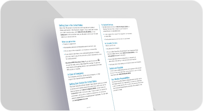 Getting Care in the United States For Inpatient Services: More than 85 percent of all doctors and hospitals in the United • Call the Service Center at 1-800-810-BLUE (2583), or States participate in the BlueCard program. If you need care outside Member Service at the number on your ID card, for your plan’s service area, call 1-800-810-BLUE (2583), or visit precertification or preauthorization bcbs.com to find a doctor near you. Be sure to show your ID card • In most cases, all you pay is the copayment, co-insurance, before you receive service. or deductible When you get service: • The hospital should submit the claim on your behalf • There’s no paperwork For Outpatient Services: • Participating doctors and hospitals submit claims for you • Show your ID card • All you pay is the copayment, co-insurance, or deductible • Pay the doctor or hospital • If you receive care from a non-participating doctor or hospital, ® Core International Claim • Fill out a Blue Cross Blue Shield Global you may need to pay for the services up front and submit a claim form for reimbursement (Call 1-800-810-BLUE (2583) or visit for reimbursement bcbsglobalcore.com for the form) BlueCard PPO Members Only: If you see this symbol, , • You’re only responsible for copayments, co-insurance, or on your ID card, you’re a BlueCard PPO member. To save the deductible when seeing in-network doctors and hospitals most money when getting service, use a participating BlueCard • You’ll pay more when seeing out-of-network doctors and hospitals PPO doctor or hospital. In Case of Emergency Doctors and Hospitals In most cases, participating doctors and hospitals will file the claim For emergency services, call the local emergency number for you. If they need information about eligibility or your coverage, or go to the nearest hospital immediately. have them call 1-800-676-BLUE (2583). Getting Care Outside the United States Your Member Responsibilities ® The Blue Cross Blue Shield Global Core network gives you access As a Blue Cross Blue Shield of Massachusetts member, you’re to doctors and hospitals around the world. If you need care, call the still responsible for any copayments, co-insurance, deductible, Service Center at 1-800-810-BLUE (2583), or call collect at or non-covered services. For out-of-country services, Blue Cross 1-804-673-1177, 24 hours a day, 7 days a week. An assistance Blue Shield of Massachusetts payments will be based on the coordinator, along with a medical professional, will arrange a provider’s charge. doctor’s appointment or hospitalization if necessary. You can also visit bcbsglobalcore.com. TEAR HERE An Association of Independent Blue Cross and Blue Shield Plans FOLD HERE Primary Care Provider’s Name: Blue Cross Blue Shield of Massachusetts complies with applicable federal civil rights laws and does not discriminate on the basis of race, color, national origin, age, disability, sex, Doctor’s Phone: sexual orientation, or gender identity. ATTENTION: If you don’t speak English, language assistance services, free of charge, Doctor’s Hospital Affiliation: are available to you. Call Member Service at the number on your ID Card (TTY: 711). ATENCIÓN: Si habla español, tiene a su disposición servicios gratuitos de asistencia con el idioma. Your Blue Cross Blue Shield Member ID: Llame al número de Servicio al Cliente que figura en su tarjeta de identificación (TTY: 711). ATENÇÃO: Se fala português, são-lhe disponibilizados gratuitamente serviços de assistência de Member Service Phone Number (from your ID card): idiomas. Telefone para os Serviços aos Membros, através do número no seu cartão ID (TTY: 711). ® Registered Marks of Blue Cross and Blue Shield Association. ®´ Registered Marks of the Blue Cross and Blue Shield Association. © 2018 Blue Cross and Blue Shield of Massachusetts, Inc., and Blue Cross and Blue Shield of Massachusetts HMO Blue, Inc. 182617M 32-5585 (02/18)