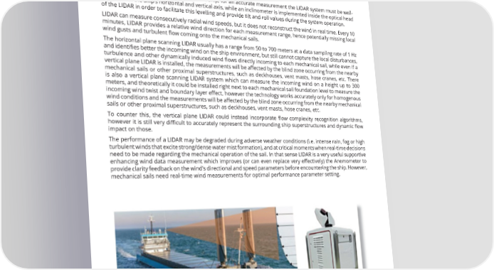 THE CRITICAL ROLE OF ACCURATE WIND MEASUREMENT FOR WIND ASSISTED SHIP PROPULSION When an horizontal pro昀椀ling LIDAR is used to scan on the horizontal plane, for example placed in front of the sail arrangement (i.e. in the forecastle deck), it can provide more incoming wind properties that the anemometer and can depict the instantly incoming undisturbed 昀氀ow right before approaching the ship interface, hence a better anticipated apparent wind data compared to the anemometer which is susceptible to surrounding air 昀氀ow disturbances. There is also a vertical pro昀椀ling LIDAR that can measure the incoming wind at a height up to 300m from the laser emitting point, so theoretically it could be installed aside a mechanical sail to measure incoming wind to several planes vertical to the sails. When it comes to a LIDAR installation on a ship, for an accurate measurement the LIDAR system must be well- aligned with the ship’s horizontal and vertical axis, while an inclinometer is implemented inside the optical head of the LIDAR in order to facilitate this levelling and provide tilt and roll values during the system operation. LIDAR can measure consecutively radial wind speeds, but it does not reconstruct the wind in real time. Every 10 minutes, LIDAR provides a relative wind direction for each measurement range, hence potentially missing local wind gusts and turbulent 昀氀ow coming onto the mechanical sails. The horizontal plane scanning LIDAR usually has a range from 50 to 700 meters at a data sampling rate of 1 Hz and identi昀椀es better the incoming wind on the ship environment, but still cannot capture the local disturbances, turbulence and other dynamically induced wind 昀氀ows directly incoming to each mechanical sail, while even if a vertical plane LIDAR is installed, the measurements will be a昀昀ected by the blind zone occurring from the nearby mechanical sails or other proximal superstructures, such as deckhouses, vent masts, hose cranes, etc. There is also a vertical plane scanning LIDAR system which can measure the incoming wind on a height up to 300 meters, and theoretically it could be installed right next to each mechanical sail foundation level to measure the incoming wind twist and boundary layer e昀昀ect, however the technology works accurately only for homogenous wind conditions and the measurements will be a昀昀ected by the blind zone occurring from the nearby mechanical sails or other proximal superstructures, such as deckhouses, vent masts, hose cranes, etc. To counter this, the vertical plane LIDAR could instead incorporate 昀氀ow complexity recognition algorithms, however it is still very di昀케cult to accurately represent the surrounding ship superstructures and dynamic 昀氀ow impact on those. The performance of a LIDAR may be degraded during adverse weather conditions (i.e. intense rain, fog or high turbulent winds that excite strong/dense water mist formation), and at critical moments when real-time decisions need to be made regarding the mechanical operation of the sail. In that sense LIDAR is a very useful supportive enhancing wind data measurement which improves (or can even replace very e昀昀ectively) the Anemometer to provide clarity feedback on the wind’s directional and speed parameters before encountering the ship. However, mechanical sails need real-time wind measurements for optimal performance parameter setting. Figure 4: LIDAR wind measurements during real wind-assist operations on a cargo ship[5] 10