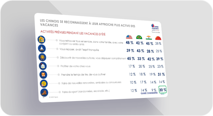 LES CHINOIS SE RECONNAISSENT À LEUR APPROCHE PLUS ACTIVE DES VACANCES ACTIVITÉS PRÉVUES PENDANT LES VACANCES D’ÉTÉ Vous retrouver tous ensemble, dans votre famille, avec votre 48% 42% 45% 28% conjoint ou entre amis Vous reposer, avoir l’esprit tranquille 39% 43% 28% 25% Découvrir de nouvelles cultures, vous dépayser complètement 45 % 33% 42% 39% Profiter de votre chez-vous 17 % 20 % 25 % 23% Prendre le temps de lire, de vous cultiver 12 % 18 % 19 % 31% Faire de nouvelles rencontres, amicales ou amoureuses 10 % 17 % 14 % 14% Faire du sport (randonnées, escalade, etc.) 12 % 14 % 9 % 30% 26 © 2017 Ipsos