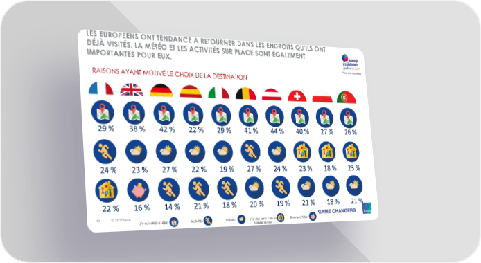 LES EUROPÉENS ONT TENDANCE À RETOURNER DANS LES ENDROITS QU’ILS ONT DÉJÀ VISITÉS. LA MÉTÉO ET LES ACTIVITÉS SUR PLACE SONT ÉGALEMENT IMPORTANTES POUR EUX. RAISONS AYANT MOTIVÉ LE CHOIX DE LA DESTINATION 29% 38% 42% 22% 29% 41% 44% 40% 27% 26% 24% 23% 27% 22% 19% 27% 24% 23% 18% 23% 22% 16% 14% 21% 18% 20% 19% 21% 18% 21% 19 © 2017 Ipsos J’y suis déjà allé(e) Activités Météo J’ai des amis / de la Bonne affaire famille là-bas