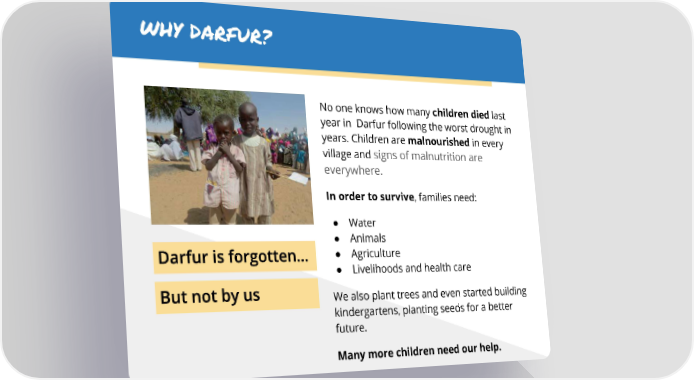 WHY DARFUR? No one knows how many children died last year in Darfur following the worst drought in years. Children are malnourished in every village and signs of malnutrition are everywhere. In order to survive, families need: ● Water ● Animals ● Agriculture ● Livelihoods and health care We also plant trees and even started building kindergartens, planting seeds for a better future. Many more children need our help.