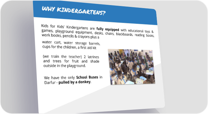 WHY KINDERGARTENS? Kids for Kids’ Kindergartens are fully equipped with educational toys & games, playground equipment, desks, chairs, blackboards, reading books, work books, pencils & crayons plus a water cart, water storage barrels, cups for the children, a first aid kit (we train the teacher) 2 latrines and trees for fruit and shade outside in the playground. We have the only School Buses in Darfur - pulled by a donkey.