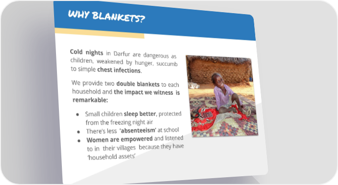 WHY BLANKETS? Cold nights in Darfur are dangerous as children, weakened by hunger, succumb to simple chest infections. We provide two double blankets to each household and the impact we witness is remarkable: ● Small children sleep better, protected from the freezing night air ● There’s less ‘absenteeism’ at school ● Women are empowered and listened to in their villages because they have ‘household assets’