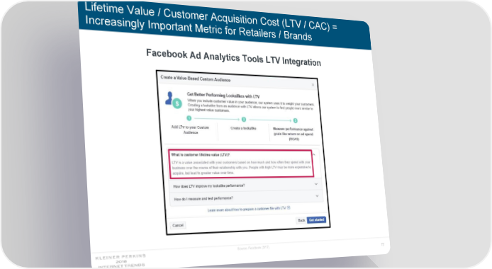 Internet Trends 2018 Page 76 Page 78Lifetime Value / Customer Acquisition Cost (LTV / CAC) = Increasingly Important Metric for Retailers / Brands Facebook Ad Analytics Tools LTV Integration Source: Facebook (3/17). 77