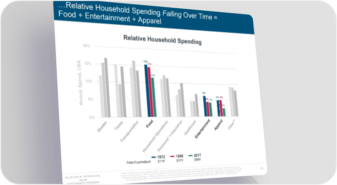 …Relative Household Spending Falling Over Time = Food + Entertainment + Apparel Relative Household Spending 20% 15% 15% 15% SA U , 12% d en 10% Sp 6% al u 5% 5% n 5% 4% 5% n A 3% 0% 1972 1990 2017 Total Expenditure $11K $31K $68K Source: USA Bureau of Labor Statistics (BLS), Consumer Expenditure Survey. *Pensions + Insurance includes deductions for private retirement accounts, social security, and life insurance. **Other Includes education and miscellaneous other expenses. Note: Results based on Surveys of American Urban & Rural Households 106 (Families & Single Consumers). 1972 data reflects non-annual survey conducted by BLS + Census Bureau to adjust CPI. 1990 and 2017 Data Based on Annual Survey performed by BLS + Census Bureau. Healthcare costs include insurance, drugs, out-of-pocket medical expenses, etc. 2017 = mid-year figures.