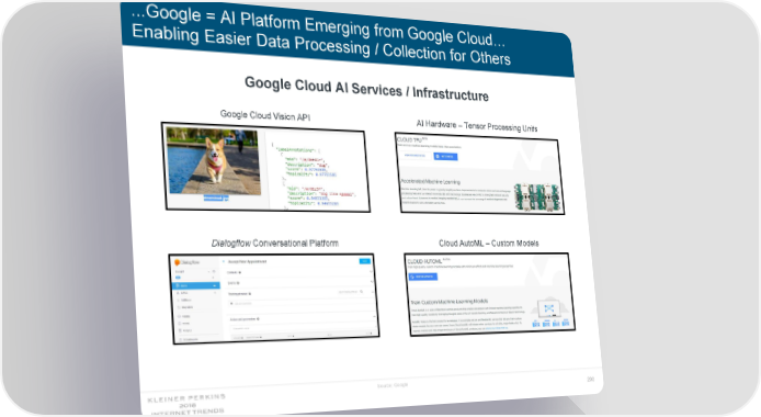 ...Google = AI Platform Emerging from Google Cloud… Enabling Easier Data Processing / Collection for Others Google Cloud AI Services / Infrastructure Google Cloud Vision API AI Hardware – Tensor Processing Units Dialogflow Conversational Platform Cloud AutoML – Custom Models Source: Google 200
