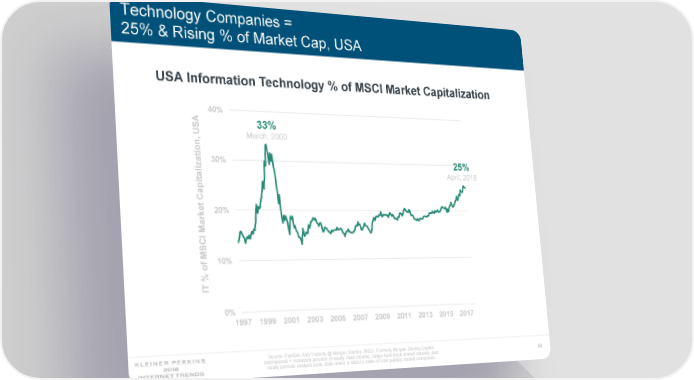 Technology Companies = 25% & Rising % of Market Cap, USA USA Information Technology % of MSCI Market Capitalization 40% 33% USA March, 2000 , on ati 30% 25% iz April, 2018 tal Capi et 20% ark M SCI M 10% of % IT 0% 1997 1999 2001 2003 2005 2007 2009 2011 2013 2015 2017 Source: FactSet, Katy Huberty @ Morgan Stanley. MSCI, Formerly Morgan Stanley Capital International = American provider of equity, fixed income, hedge fund stock market indexes, and 39 equity portfolio analysis tools. Data refers to MSCI’s index of USA publicly traded companies.